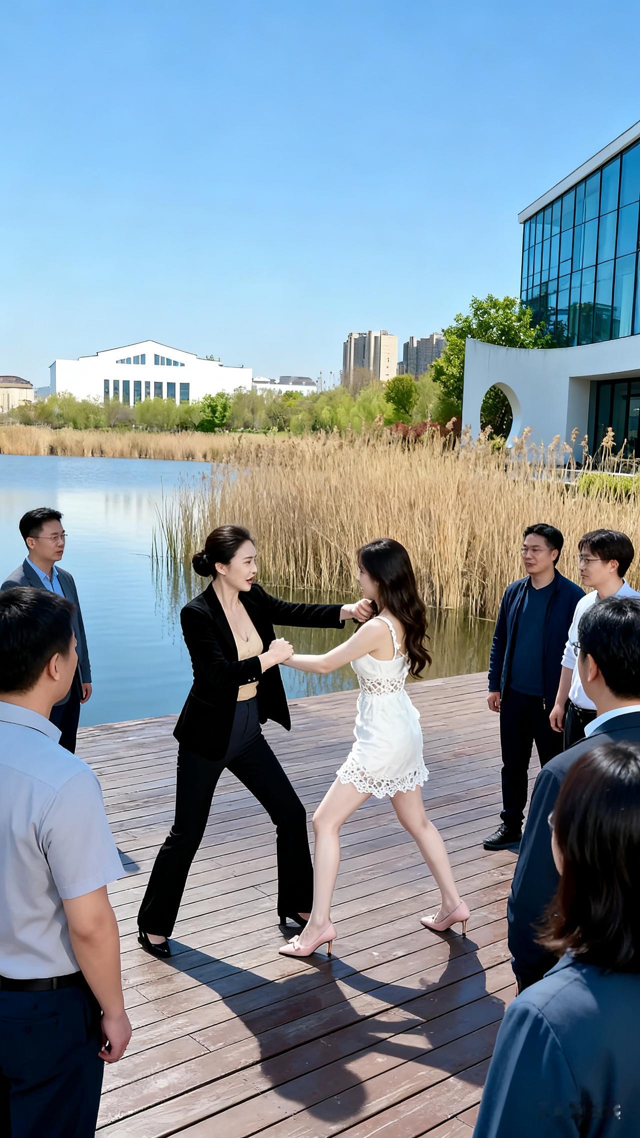 今天在湖边可算是开了眼,两位女士居然在这儿上演力气对决。只见她俩双手紧紧相扣,都铆足了劲儿想要把对方扳倒。那架势,仿佛周围的一切都不存在了。旁边围了好多人,都静静地看着这场“较量”,没人说话,估计都被这阵仗给吸引住了。也不知道最后谁能赢,这力气大比拼,还挺有看头!