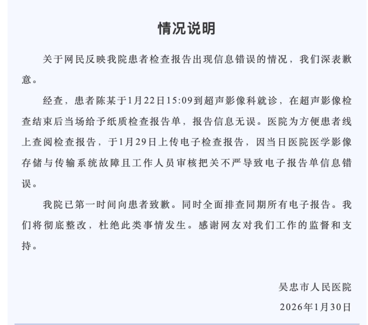 73岁大爷彩超报告显示”宫内早孕“,医院甩锅给系统? 最近看到个让人哭笑不得的新闻——宁夏一位73岁的老大爷去医院做检查,结果电子报告单上赫然写着“宫内早孕”。这要是老大爷自己看到,估计得吓一跳:我这岁数还能老来得子? 医院一开始解释说“可能是系统推送问题”。这话术挺耳熟,跟“临时工干的”有异曲同工之妙。后来发通报说,纸质报告没错,是电子系统故障加上工作人员没仔细核对。 好家伙,这下“系统”又成了背锅侠。 咱们来分析分析这事有多离谱: 第一,一个73岁的男性患者,报告上出现“宫内早孕”这种明显不合逻辑的结果,审核人员但凡扫一眼都能发现问题。这说明什么?说明所谓的“审核”很可能就是走个流程,根本没人真的在看。 第二,医院发现问题后的第一反应不是承认错误,而是甩锅给“系统推送”。这就跟小孩子打碎东西说“是桌子先动的手”一样,缺乏基本的担当。 第三,这么明显的错误,如果不是患者家属及时发现并发到网上,医院会不会主动联系患者更正?我表示怀疑。 这背后暴露的是医疗系统里普遍存在的“电子化依赖症”。 现在很多医院过度依赖电脑系统,觉得系统生成的就不会错,工作人员成了“点击鼠标的工具人”。可电脑是死的,人是活的啊! 我亲戚上个月也遇到过类似的事。去拿药,电脑系统显示剂量是正常量的十倍。幸好药房阿姨多问了一句:“你确定要这么吃?”这才避免了事故。事后查出来,是医生在电脑上选错了单位。 当医疗变成“流水线作业”,人命关天的事就可能变成“批量生产”中的一个小误差。 更让人担心的是,这次是“早孕”,下次万一是“恶性肿瘤”呢?万一是用药剂量呢?患者拿着错误的报告去别的医院就诊,耽误了治疗,谁负责? 医院道歉是应该的,但光道歉不够。得查清楚: 所谓的“审核流程”到底存不存在? 如果存在,为什么形同虚设? 除了这个案例,还有多少类似错误没被发现? 怎么保证以后不再发生? 医疗无小事,任何一个环节的疏忽,都可能以生命为代价。 现在我想问问大家: 你们在看病时遇到过类似“乌龙”吗? 你觉得医院电子化是方便了患者,还是增加了风险? 对于这种明显错误,除了道歉,医院还应该做什么?
