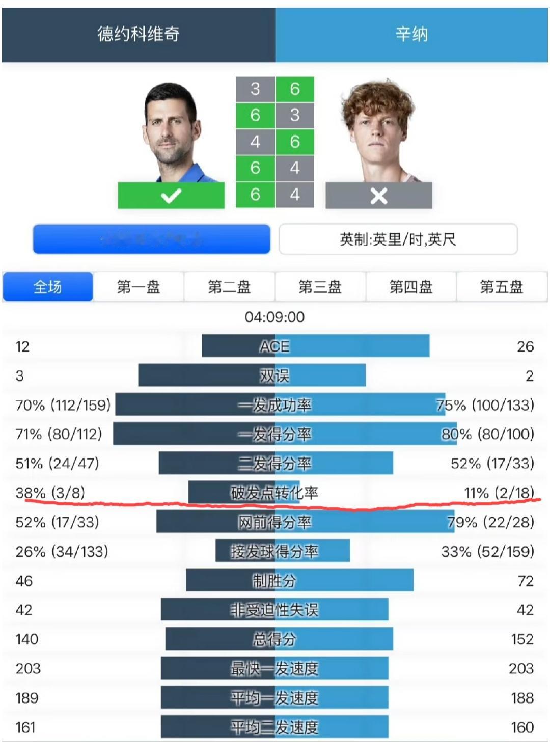 辛纳2:3输给德约,他在哪些方面做的不够好,才导致他输掉了这场比赛? 赛后的技术统计显示,辛纳在数据上全面碾压了德约,仅仅是因为德约在破发点的把握上比他做的更好一点,德约破发点转化上面比辛纳多了一次。 德约全场拿到3个破发局,赢下3盘,从而赢下了这场五盘大战。所以说,网球比赛第一要务是保住自己的发球局,再对对方的发球局徐徐图之。自己的发球局都保不住,一切都是空谈。女子网球就是如此,很多球员成绩上不去,就是保不住自己的发球局。而在这一方面,萨巴伦卡就做的非常好,她关键分的把握上足可以跟德约相媲美,特别是抢七,好像这几年就输了一场抢七吧,足见其强大的关键分把握能力!
