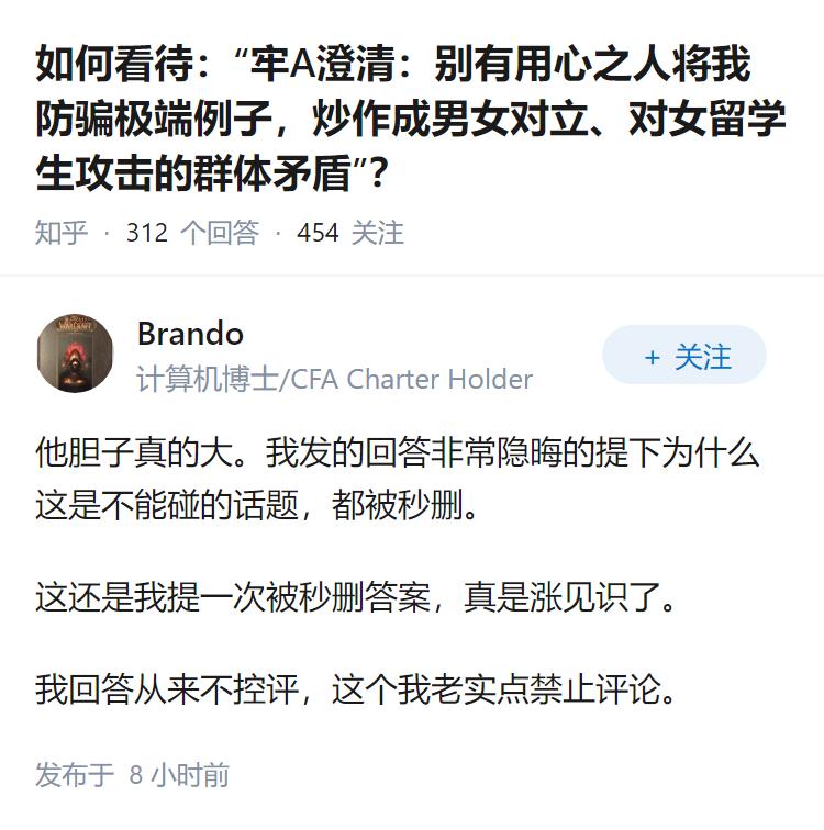如何看待:“牢A澄清:别有用心之人将我防骗极端例子,炒作成男女对立、对女留学生攻击的群体矛盾”?