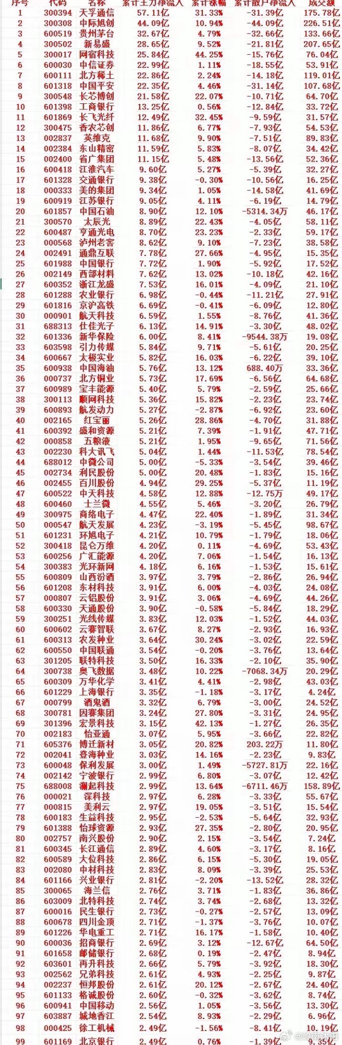 本周主力低位大幅买入个股TOP100(核心数据+资金解析)一、 主力低位大幅买入个股TOP15(资金规模排序)1. 300394 天孚通信:主力净流入57.11亿,涨幅31.33%,散户净流出31.39亿,成交额175.78亿2. 300308 中际旭创:主力净流入44.09亿,涨幅10.94%,散户净流出44.09亿,成交额226.51亿3. 600519 贵州茅台:主力净流入32.67亿,涨幅4.79%,散户净流出32.66亿,成交额133.66亿4. 300502 新易盛:主力净流入28.65亿,涨幅9.52%,散户净流出21.81亿,成交额207.65亿5. 300017 网宿科技:主力净流入25.84亿,涨幅44.25%,散户净流出15.76亿,成交额76.04亿6. 600030 中信证券:主力净流入22.99亿,涨幅1.11%,散户净流出18.55亿,成交额53.91亿7. 600111 北方稀土:主力净流入22.86亿,涨幅2.24%,散户净流出14.18亿,成交额119.01亿8. 601318 中国平安:主力净流入22.35亿,涨幅4.46%,散户净流出31.14亿,成交额107.68亿9. 300548 长芯博创:主力净流入21.58亿,涨幅22.07%,散户净流出10.71亿,成交额64.70亿10. 601398 工商银行:主力净流入13.25亿,涨幅0.56%,散户净流出12.84亿,成交额33.72亿11. 601869 长飞光纤:主力净流入12.49亿,涨幅32.45%,散户净流出9.59亿,成交额31.57亿12. 300475 香农芯创:主力净流入11.86亿,涨幅6.77%,散户净流出7.93亿,成交额54.53亿13. 002837 英维克:主力净流入11.68亿,涨幅9.90%,散户净流出7.51亿,成交额89.83亿14. 002384 东山精密:主力净流入11.59亿,涨幅5.83%,散户净流出8.07亿,成交额34.42亿15. 002400 省广集团:主力净流入11.15亿,涨幅5.48%,散户净流出13.56亿,成交额52.36亿二、 主力资金布局核心特征(全维度解析)1. 科技赛道成吸金核心,光通信+算力领涨(资金+涨幅双优)主力资金布局高度集中,光通信、算力相关科技股稳居吸金榜首,榜单前五中天孚通信、中际旭创、新易盛均为光模块、算力核心标的。其中天孚通信以57.11亿主力净流入居首,同步斩获31.33%涨幅,实现资金与涨幅双领跑;网宿科技凭借25.84亿主力净流入,拿下榜单最高44.25%涨幅,资金做多科技赛道意愿强烈。且科技股均呈现主力吸筹、散户离场的典型特征,散户资金全线净流出,筹码向主力高度集中。2. 大消费+金融权重稳健吸金,成避险配置核心贵州茅台、中国平安分别以32.67亿、22.35亿主力净流入,位列榜单第三、第八,工商银行等国有大行也获主力持续加仓,成为资金避险与长期配置的关键方向。这类标的虽累计涨幅普遍低于5%,但市值与成交额体量庞大,主力资金持续流入,凸显市场对核心资产的配置需求;同时散户净流出规模同步走高,尤其中国平安散户净流出31.14亿,与主力流入形成鲜明反差,筹码交换特征突出。3. 周期+制造+能源股分化,少数标的多空同向部分周期股、传统制造及能源股获主力小幅布局,表现差异显著:北方稀土、中国石油、中国海油等获主力净流入,中国石油以8.90亿净流入、12.10%涨幅成为能源股亮点;仅中国海油、博迁新材、海油发展三只标的,出现散户与主力资金同向流入,为榜单中罕见的资金共识标的。而航发动力、中微公司、航天发展等高端制造、半导体标的,虽获主力净流入,但股价涨幅为负,或为资金提前布局,股价与资金暂未同步。4. 资金博弈显著,筹码加速向主力集中当前市场资金博弈特征突出,绝大多数标的呈现主力净流入、散户净流出的反向格局,仅3只标的实现资金同向,且散户净流出规模与主力净流入规模高度匹配,如中际旭创主力净流入44.09亿、散户净流出44.09亿,筹码从散户向主力集中趋势明确。成交额方面,科技股与权重股活跃度领先,中际旭创、新易盛成交额均超200亿,资金承接能力强劲。5. 资金效率差异悬殊,小盘股弹性远超大蓝筹不同标的主力资金撬动效率差异显著:小盘股资金效率更高,宏景科技仅3.15亿主力净流入便涨42.13%,红宝丽5.26亿净流入对应28.86%涨幅,百川股份4.94亿净流入实现29.25%涨幅,均依托小流通盘实现高效拉升;银行、保险等大盘蓝筹股,虽获主力加仓,但涨幅普遍在1%-5%,股价弹性较低,主力更多是长期配置而非短期炒作。6. 少数标的资金流入但股价下跌,或存洗盘可能部分标的出现主力净流入、股价却下跌的背离情况:航发动力主力净流入5.27亿,累计跌幅2.87%;中微公司主力净流入5亿,跌幅5.33%;航天发展主力净流入4.23亿,跌幅3.19%。这类标的或受板块环境、业绩预期等影响,股价暂未跟随资金上行,不排除主力布局后的洗盘动作,后续需关注基本面改善及板块催化,能否推动股价跟上资金节奏。
