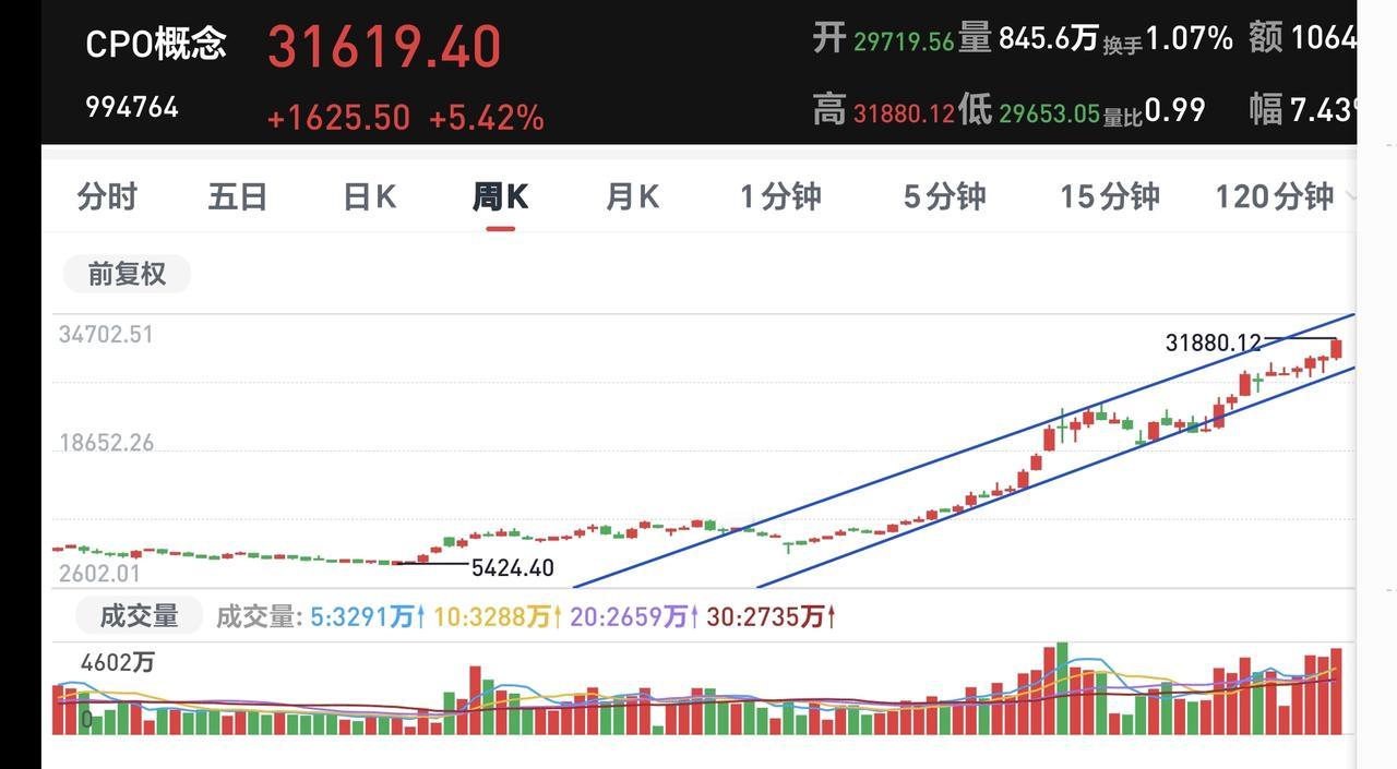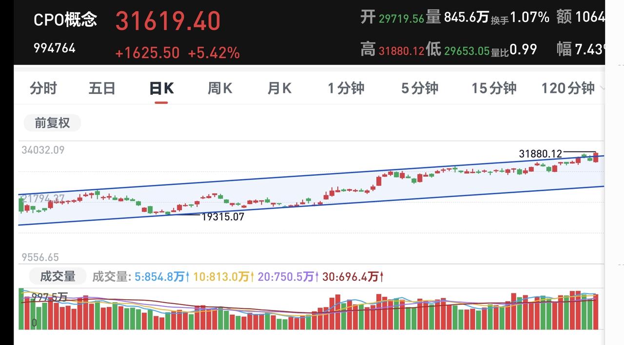 基金:看不到估值,就考虑退出了,本就很难,再看不到估值,一般人就亏的无边了。 这是一位朋友的留言,谢谢这位朋友。 我认为: 1:能不能看到估值,对我们操作的影响不大,玩基金并不是每天都要知道涨跌幅度的,因为,我们并不是每天都操作,我们的操作是阶段性的,阶段性的低位区域,哪一天进场都可以,阶段性的高位区域,哪一天离场影响也不大。 2:看不到每天的估值,对于那些追涨杀跌的人是有好处,可以让他们盘后冷静思考,可以让他们有充足的思考时间,而不是在盘中看到大幅的上涨就追进,看到大幅的下跌就杀出,会大幅度减少他们的追涨杀跌,追涨容易让他们挂在山顶上,杀跌容易让他们出在地板处。 3:我们来举例说明,星期五上涨幅度最大的三个板块是:cpo板块,通信板块,双创50板块,Cpo板块上涨了3.25%,持有人数在所有板块当中排名第7位,散户人数也是不少。 看下面的截图4,这是cpo板块日K线图,星期五上涨突破了这个板块上涨通道上轨线,短线持有这个板块的人,可以继续持有,而不可以追涨,不管你持有这个板块当中的哪一只基金,操作策略都是差不多这样。 看下面的截图5,这是cpo板块周K线图,现在的位置处于这个上涨通道内,长线持有的人可以继续持有,由于现在的位置距离上涨通道上轨线更近一些,所以,长线进场也需要谨慎,不管持有这个板块中的哪一只基金,操作策略也都是这样。 通过cpo板块的情况,我们可以看出,盘中估值对我们操作并不是有决定性的影响,影响你的是,你究竟知不知道你持有的基金属于哪一个板块,你持有基金所属板块现在的情况,把这两个问题弄明白了,有没有盘中实时估值,对你也就没有大影响了。 有没有人不知道自己持有的基金属于什么板块的,有没有人不知道自己持有基金板块当今是什么情况的,你可以在评论区写出来,大家可以相互回答一下,哪只基金属于哪一个板块,这是最起码应该知道的事情,如果真的有不知道的人,可以趁这个周末把这个事情弄明白。 花一秒钟点赞,花30秒钟评论,就是对我最大的支持,谢谢大家的支持。