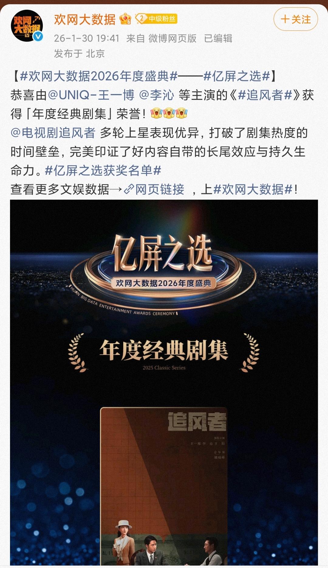 王一博主演的电视剧《追风者》荣获欢网大数据年度经典剧集! 2024年的《追风者》,2026年还能获得“年度剧集”的荣誉,这份优秀作品含金量不言而喻。“” 《追风者》截止目前在各大电视台已经150多轮的播出,“多轮上星表现优异,打破了剧集热度的时间壁垒,完美印证了好内容自带的长尾效应与持久生命力”。 王一博 王一博追风者魏若来