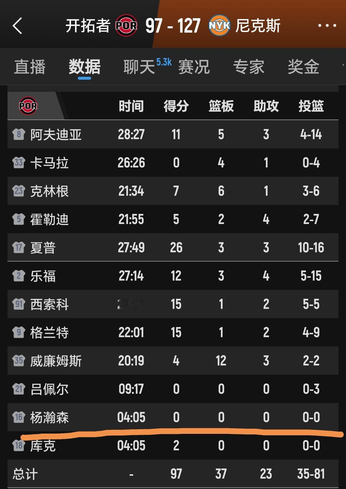 杨瀚森在4分钟的垃圾时间里把唯一一次大弧顶持球机会传给了底线的队友,此外就是傻俊地跟跑了4分钟!没一个队友为他传球,没一个队友不是单干,既便他们4分钟里总共就投进了2分! 0投0分0板0助0断0帽!全部数据均为0!不知道还以为杨瀚森又被DNP了! 斯普利特绝了,总是在杨瀚森上一场比赛打的还不错的情况下不给机会。上次是打火箭后连续DNP! 这次是打完奇才后,面对尼克斯第一节就落后了20多分,全场没有任何取胜几率的情况下,吕佩尔又是上了10分钟左右,一堆0数据仍对小杨无视,直到最后4分钟仍然落后20多分才派上场,身边是4个争合同要饭吃不配合,不传球的跑攻手,还真不如不上呢?
