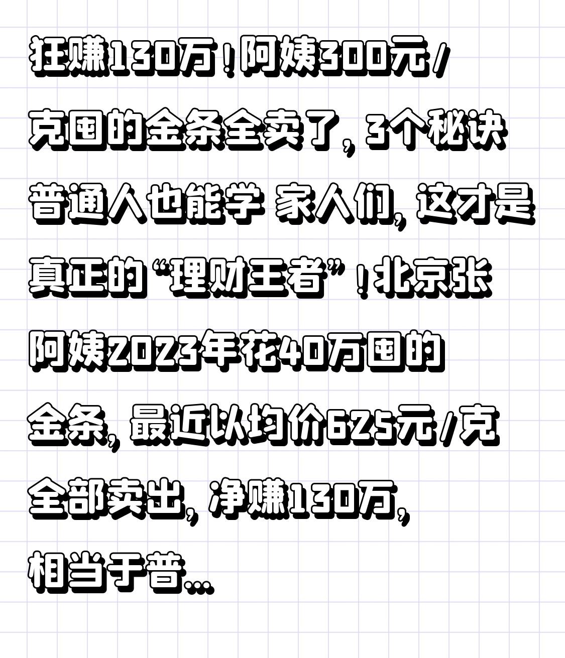狂赚130万!阿姨300元/克囤的金条全卖了,3个秘诀普通人也能学 家人们,这才是真正的“理财王者”!北京张阿姨2023年花40万囤的金条,最近以均价625元/克全部卖出,净赚130万,相当于普通人打工10年的收入😭 要知道现在国际金价都突破5300美元/盎司了,国内金店足金卖到1700元/克,而阿姨入手价才300元,她到底踩中了什么风口? 说出来你可能不信,阿姨买金条的时候,正是大家最不看好黄金的时候!2023年初金价才1800美元/盎司,国内金条均价300元/克,身边朋友都劝她“买理财、投基金”,说黄金是“老年人才买的过时资产”。但阿姨不听劝,拿着给儿子结婚的钱,分批在银行买了1300多克投资金条,还特意避开了纪念金条和黄金首饰,就选最朴素的银行金条。 这里藏着第一个关键转折:阿姨根本不是瞎买!她退休前是会计,早就摸透了黄金投资的门道。别人追高买品牌金饰,她专挑银行APP的线上渠道,因为线上金条比线下门店便宜10-20元/克,还能省掉手续费;别人一次性梭哈,她每月固定买200克,摊薄成本,2023年金价回调时还多补了500克;更聪明的是,她从不碰“一口价”黄金,也不买工艺复杂的首饰,因为这些产品溢价高,变现时亏得惨。 更让人佩服的是她的止盈眼光!2025年金价暴涨62.7%,身边人都喊着“能涨到6000美元”,劝她再等等,阿姨却果断出手。她算了一笔账:3年涨了130%,已经远超预期,而且高盛虽然预测2026年底能到5400美元,但市场波动太大,见好就收才是王道。果然,她卖出后没几天,金价就回调了3%,那些贪心的人反而亏了差价。 其实阿姨的成功,普通人也能复制3个秘诀:第一,选对渠道!优先银行投资金条或黄金ETF,溢价低流动性好,深圳水贝批发市场也是刚需首选,比金店便宜300元/克;第二,择时买入!每年春节后、6-8月是黄金淡季,价格通常低5%-8%,别在节假日追高;第三,控制比例!黄金占家庭资产5%-20%就够了,别把全部积蓄都砸进去。 现在很多人看到金价疯涨就慌了,要么盲目跟风,要么不敢下手。但阿姨的经历告诉我们,投资赚的不是运气,是认知和耐心。那些想着“一夜暴富”的人,往往容易被割韭菜;而脚踏实地研究规则、理性布局的人,才能在市场中站稳脚跟。 你现在手里有黄金吗?是打算持有还是卖出?评论区聊聊你的看法,关注我,下期分享黄金变现的避坑指南,让你多赚一笔!