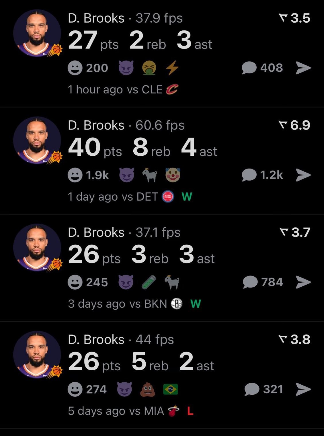 继上一场40分带队赢活塞之后,狄龙再拿27分,太阳大胜骑士了。布克缺席的四场,龙