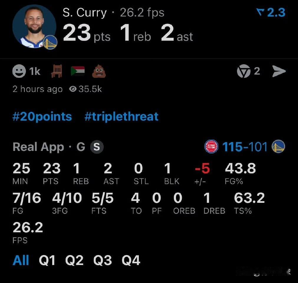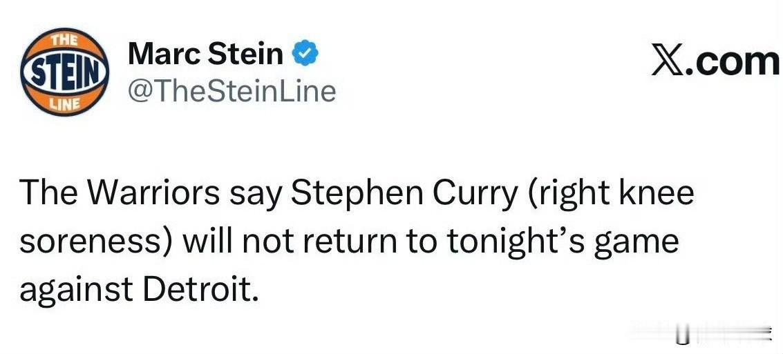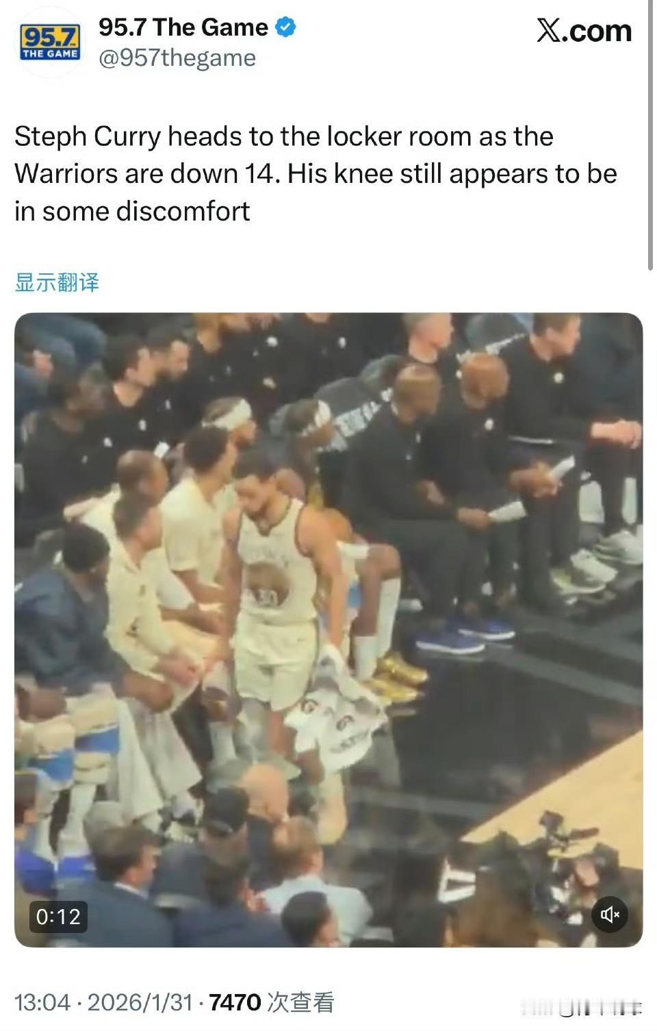库里右膝酸痛提前退赛! 今天勇士队主场对阵活塞队的比赛中,第三节末段,库里在一个回合完成上篮得分并完成犯规后便面露痛苦之色,随后一瘸一拐返回了更衣室,目前由斯宾塞顶替出战。 在更衣室接受初步的检查后治疗后,为了保险起见,勇士队方面宣布库里因右膝酸痛提前退出本场比赛,离场前得到23分,球队还落后11分之多。库里的伤退无疑让球队雪上加霜,想要赢球需要更多的角色球员挺身而出。