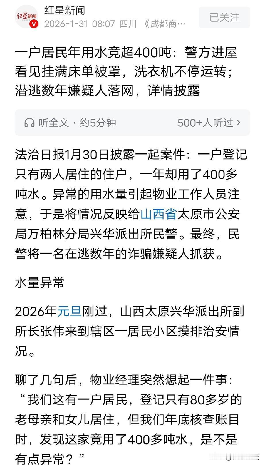 法网难逃!三西太原,一户人家一年用了400多吨水,水量大的异常,物业上门查漏水,老太太堵门不让进,物业报了警,民警调查发现老太太儿子曾骗别人20万,后躲在老母亲家里天天早出晚归,鬼鬼祟祟,民警用了一招儿,破门而入,成功抓住老太的儿子,可眼前的一幕让人惊呆了,而得知水量异常的原因后,更是让人哭笑不得。 某个小区里,有一户人家,一年用水量居然达到了400多吨。这家居住登记只有八十多岁老母亲和女儿。 就算是一大家子人天天敞开用,也不可能用这么多,物业察觉不对后赶紧报了警。 派出所的张警官一打听,发现情况不止用水异常这么简单。 物业之前上门查漏水,老太太次次都把工人堵在门外,说自家水管绝对没问题。 更奇怪的是,有一次水暖工明明看到的是老太太的儿子开门,但这户人家的居住登记里根本没有这个人。 “登记的女儿怎么成了儿子?老太太为啥不让工人进门?”张警官越想越觉得这事不对劲。 他开始走访小区、调监控,发现老太太的儿子刘某天天早出晚归,出门总是帽子口罩遮得严严实实,连小区物业都没见过他的真面目。 不过大家对他印象很深,因为他天天骑着一辆粉红色的自行车,在一众深色自行车里格外扎眼。 顺着户籍信息一查,张警官吓了一跳:这个刘某居然是忻州警方追了好几年的诈骗逃犯!几年前他以找工作为幌子骗了别人20万,之后就销声匿迹了。 但新的疑问又冒出来了?那400多吨水到底用来干什么了?难道他除了诈骗还干了别的大案? 张警官没敢贸然行动,带着同事蹲守了一晚上都没等到刘某回家,第二天一大早终于在楼下看到了那辆标志性的粉色自行车。 为了不打草惊蛇,张警官灵机一动,想出一招儿,借着小区检查楼道杂物的由头,让物业工作人员先挨家敲门提醒。 果然,听到敲门声的刘某放松了警惕,穿着秋衣秋裤就开了门。 等工作人员确认他在家没一点防备后,没过几分钟,张警官就在外面喊了一声,怎么不清理一下门口纸箱,再次敲开了门。 门一开,警察立刻冲进去把刘某控制住,眼前的景象让大家吃了一惊,只见屋里挂满了洗好的床单被罩,床上椅子上都搭着没晾干的衣服,卫生间的洗衣机还在咕噜咕噜转着,发出沉闷的嗡嗡声。 刘某被抓住了,那400吨水到底是怎么回事呢?可答案竟然出乎所有人的意料。 原来,这几年刘某过得提心吊胆,不敢用手机,更不敢去需要登记身份证的地方打工,只能在小饭店打零工。 精神压力大到每天失眠,直到后来他发现听洗衣机转动的声音能让自己平静下来,甚至能睡着。 于是只要在家,他就不停地洗衣服,好多衣服还没晾干,就又丢进洗衣机反复洗,就这么硬生生把水费洗成了异常数据,把自己的行踪彻底暴露了。 现在刘某已经被移交给忻州警方,刘某靠“洗衣”解压的潜逃闹剧,最终还是输给了一块小小的水表。 所以说,做人不要干坏事,为了骗20万整天东躲西藏、担惊受怕,把自己搞得精神崩溃,大部分最初都觉得自己是能逃脱法律制裁的那一个,最后都在刑警到来的时刻把悬着的心放下了,解脱了。终点又回到起点,却已颠沛半生。不值得啊! 有网友说,听洗衣机的声音能助眠,天天回家打开洗衣机洗衣服、被褥,有时候还没等晒干就又扔回去洗了,他每天去附近饭馆挣点微薄的收入,够水电钱吗? 还有人说,这个人虽然总是用帽子和口罩把自己遮挡得严严实实,却骑着一辆粉红色的自行车,他到底是咋想的。 还有就是老人,明知道儿子是逃犯还帮着隐瞒,其实也是可怜天下父母心。但这种包庇其实害了儿子也害了自己,要是早点劝儿子自首,也不至于让他在恐惧里熬这么多年。 最有意思的是那辆粉色自行车,骗子想把自己藏起来,结果选了个最显眼的代步工具,简直是黑色幽默。这也说明,人要是心里有鬼,再怎么伪装都藏不住破绽,要么是行为反常,要么是脑子混乱,总有露马脚的时候。 另外,刘某可能构成诈骗罪。 刘某以找工作为诱饵诈骗他人20万元后潜逃数年,显然从一开始就没有归还财物的打算,完全是想将他人财物据为己有。 他虚构“能帮人找工作”的事实,让人产生错误认识,误以为花钱就能获得工作机会。 被骗的人因为相信了刘某的谎言,自愿将钱交给了他,损失了20万元。 而刘某将这笔钱据为己有后潜逃,满足诈骗罪“行为人取得财产、被害人受损失”的结果要求。 《刑法》第266条规定:诈骗公私财物,数额巨大或者有其他严重情节的,处三年以上十年以下有期徒刑,并处罚金。 刘某诈骗的20万元已经远超“数额巨大”的标准,完全达到了诈骗罪的立案量刑要求。 说来说去,违法犯罪真的没好下场。你以为能躲一辈子,其实每天都在受精神折磨,最后还是得被抓。与其天天提心吊胆,还不如当初就别干这事。 莫伸手,伸手必被抓这句话,真不是说说而已。