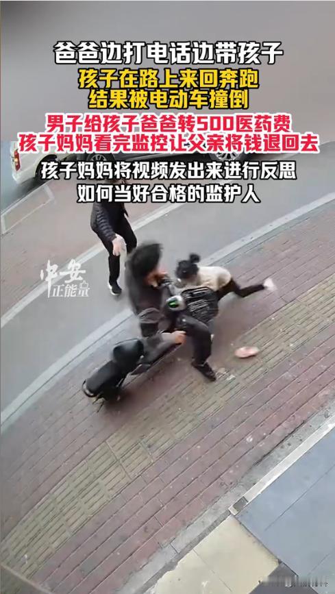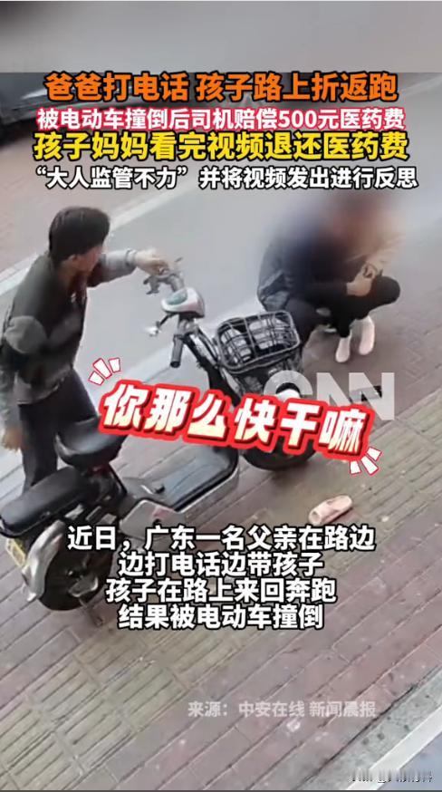 “全网怒赞!”1月28日,广东,一男子在路边边打电话边看孩子,两个孩子开始疯跑起来,下一秒女儿就被一辆快速驶来的电动车撞倒擦伤,电动车车主赔偿了500元,但孩子妈妈得知后,坚持认为主要是家长看护不周,主动要求爸爸把钱退回。 日常生活中,家长带孩子外出时难免会有疏忽,加上小孩子正处于疯玩的阶段,随时都可能引发意外,尤其是在马路上时,孩子特别容易疯跑,完全意识不到危险。 这天,男子在自家店门口陪着儿子女儿玩,而后突然来了个电话,就随手接了起来。两个孩子这时候开始玩起了追逐的游戏,此时一辆电动车快速驶来,躲闪不及后直接撞上了小女孩,导致孩子摔倒受伤。 男子顿时愤怒至极,则被电动车骑得太快,检查孩子没什么大事后,电动车车主随后主动赔偿了500元。孩子妈妈得知后查看监控发现是丈夫没看住孩子,才让女儿在马路上乱跑导致被撞的,完全不赖摩托车,于是立刻要求爸爸把钱退回去。 女子的做法获得了网友的一致点赞,但这件事也给所有家长敲响了警钟。带娃外出时一定要集中注意力,不要玩手机、打电话或分心做其他事,时刻紧盯孩子的动向,才能避免意外发生。 信息来源:《爸爸带娃分心打电话,孩子在路上来回奔跑时不慎被电动车撞伤,司机主动赔偿500元医药费。孩子妈妈查看监控了解经过后,批评爸爸监护不力,并要求爸爸将医药费退还给司机。》西安晚报