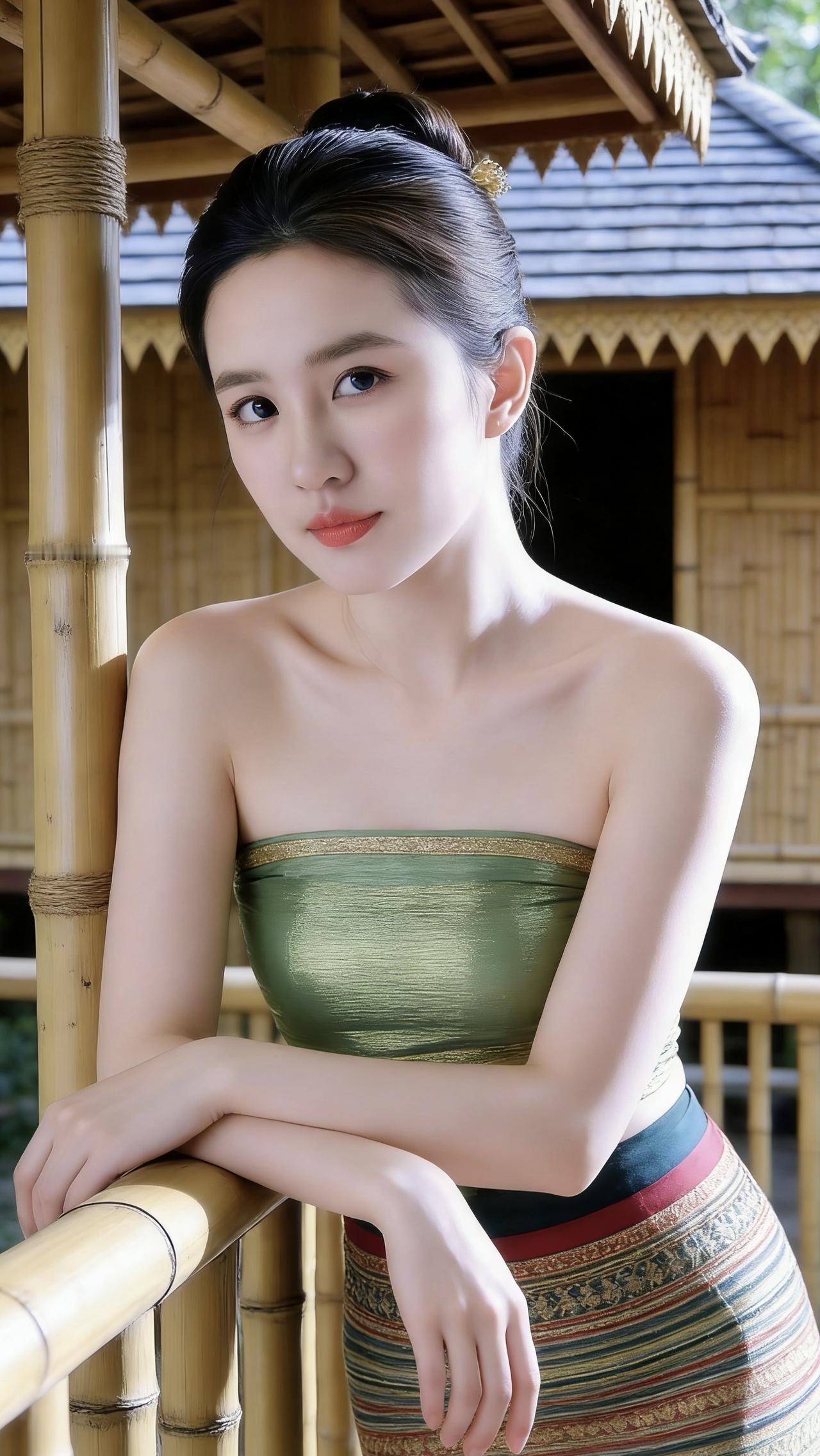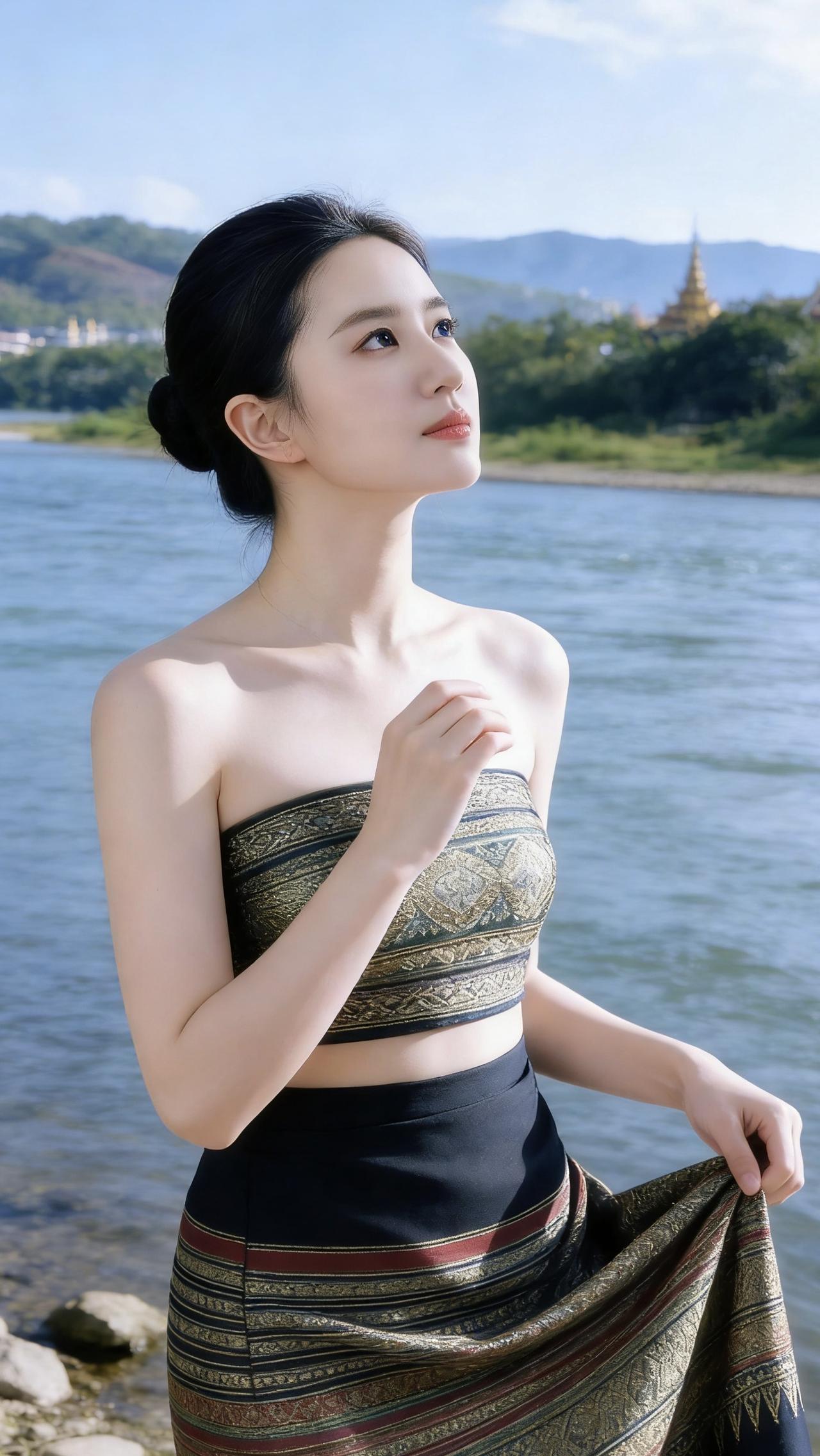 我站在澜沧江边的石阶上,指尖捏着筒裙的裙摆,风把织锦纹样吹得轻轻晃。身上的傣族服饰是阿姐用傣锦织的,抹胸是墨绿混着金线的纹路,筒裙的织锦嵌着红棕相间的条纹,像把江边的棕榈叶与落日都缝进了布料里。 乌发在脑后盘成圆髻,只鬓边漏出几缕碎发,被江风卷着蹭过耳尖。抬眼望向对岸的佛塔,金顶在阳光下泛着细闪,我想起阿婆说,傣锦的纹样里藏着傣家的水与林,穿着它,就带着寨子的温度走四方。 午后我靠在竹楼的栏杆上,竹影在衣料上投下细碎的光斑,风里混着缅桂花的甜香。此刻我抚着筒裙的织锦,忽然觉得这一身带着水汽的衣装,连同江边的风,都是我们傣族姑娘把日子浸在温柔里的模样。 澜沧江旅游 澜沧江观景台 傣风美人照 澜沧江长河 蒙蒙傣味 璟澜傣服饰 傣江南