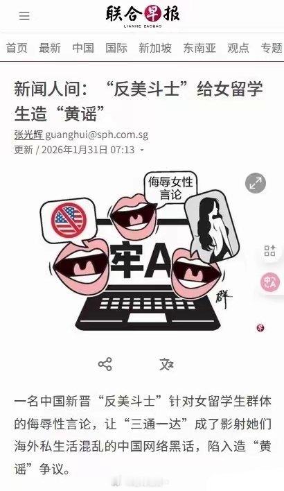 新加坡的联合早报连发几篇评论攻击牢A它给取的名字就很有煽动性:“反美斗士”给女留学生造“黄谣”。首先,大家都知道,牢A是很同情美国底层人民的,所以这“反美斗士”由何而来?再者,牢A说的是一部分不学好的留学生,男女都有,其目的也是在于提醒,如果事实存在,哪来的“造谣”?现在别有用心的人把女学生单独剪切出来做文章,“造黄谣”的正是他们,与牢A何关?只不过是这部分人狗急跳墙,故意把事情扩大化。。。。
