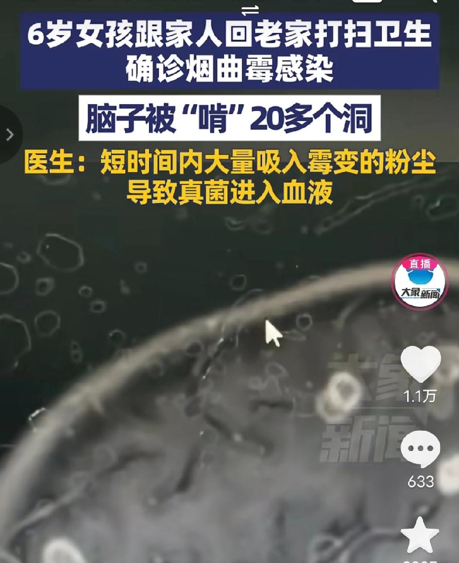 让人惊呆了!河南郑州6岁女孩回老家打扫卫生,结果就半天感染霉菌,发烧17天后确诊