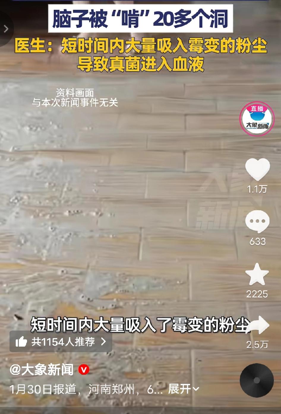 让人惊呆了!河南郑州6岁女孩回老家打扫卫生,结果就半天感染霉菌,发烧17天后确诊,脑部被真菌侵蚀出20多个空洞,医生警告:再晚就不可逆了! 郑州6岁女孩朵朵(化名)跟着爸妈回乡下老房备年货,房子空了大半年,推门满是霉味,墙角家具全是暗绿霉斑。一家人没做防护就打扫,朵朵拿着小扫帚,蹲在地上扫着积了半年的灰尘,扬起的粉尘混着霉菌孢子在阳光里打转。 打扫完的第二天,朵朵就开始发烧,一开始家人以为是普通感冒,吃了退烧药却不见好转。烧到第17天的时候,孩子突然意识模糊、胡言乱语,家人这才慌了神,连夜把她送到郑州大学第一附属医院。 脑部CT的结果让所有人都倒吸一口凉气:朵朵的脑组织里布满了密密麻麻的空洞,最大的直径接近1厘米,整整20多个洞,最终确诊为烟曲霉感染——正是那天打扫时吸入的霉变粉尘,让真菌通过呼吸道进入血液,一路侵袭到了大脑。 郑大一附院的医生说:“如果再晚来几天,孩子的脑组织可能会被严重侵蚀,造成永久性的神经损伤,甚至危及生命。” 此事引发网友热议 - 孩子才6岁太揪心!老家打扫从没戴过口罩,现在想起来后背都发凉,这风险真的太容易被忽略了 - 我家老房空一年,本想随便扫扫就住,看完立刻决定先通风3天,防护做好再动手 - 返乡过年打扫的家庭太多了,这种安全警示必须转,很少有人普及这个隐藏风险,别让更多孩子中招了 说白了,这事儿给所有准备返乡过年的家庭提了个醒:久未居住的老房子里藏着看不见的风险,打扫时千万不能大意。先开窗通风、戴好口罩手套、用湿抹布擦灰,别让团聚的喜悦变成揪心的悲剧。 你回老家打扫时,会特意戴口罩防护吗? 6岁女孩感染烟曲霉 老家打扫卫生风险 真菌入侵大脑 民生警示 来源:大象新闻及网络公开内容,如有侵权请联系即删 配图说明:本文配图/视频素材来自@ 大象新闻,仅用于内容分享,侵权联删
