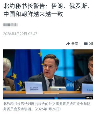 北约秘书长吕特说了一句话,他说伊朗,中国跟俄罗斯,朝鲜开始合作,虽然对我们造成了威胁,但是还是不如我们团结。   其实这话放在以前还有几分可信度,现在美国对自己的盟友可以说大开杀戒了,格陵兰岛也要,关税也加,你说这几个国家合作很好,真以为我们看不见美国的所作所为。   说我们有威胁,北约这么多成员国,包括法国,德国,加拿大跟英国都访华,这是因为我们有威胁而访华吗,不是,是因为他们感觉美国对自己有威胁,是美国在威胁自己的盟友。   现在北约已经到达破碎的边缘了,美国都要退出北约了,现在还在这宣传团结。   这也表明北约各成员国并不是铁板一块,而是加拿大,美国跟欧盟三方势力控制,在关键问题他们还是会有分歧的。