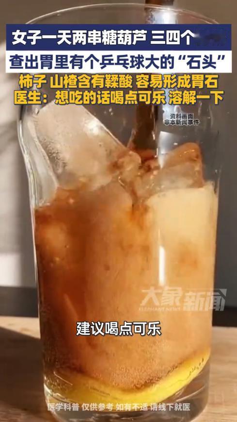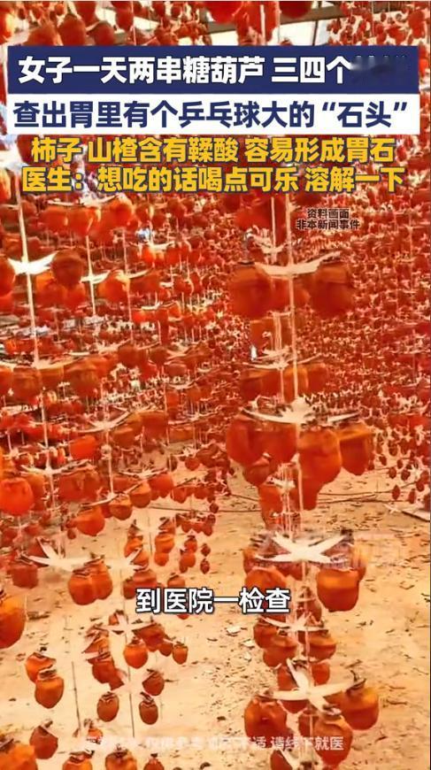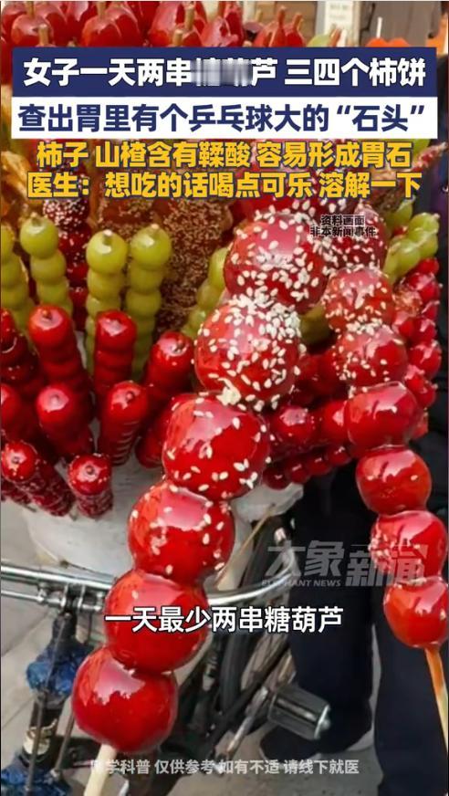 “太吓人了!!”1月28日,河南郑州,一名30多岁女子连续半个月每天吃两串糖葫芦、三四个柿饼后,突然剧烈腹痛、反酸呕吐,连喝口水都钻心疼!就医检查后,竟发现胃里长了颗乒乓球大的坚硬“石头”,已经磨得胃黏膜出血,网友:爱吃山楂、柿子的我怕了! 秋冬季节,酸甜的糖葫芦、柿饼是不少人的心头好,但这类食物里的鞣酸,遇上胃酸容易凝结成块,长期大量食用就可能形成胃石。 据媒体报道,女子特别喜欢吃酸甜类的东西,觉得很是爽口开胃。最近半个月,她几乎每天都要吃几串糖葫芦和柿饼子,有的时候即便是早起没吃饭,也会吃点。没过几天她就感到胃胀、反酸,以为是消化不良,于是吃了些健胃消食片。 没想到后来越来越严重,她开始剧烈腹痛、恶心呕吐,连喝水都疼,感到害怕后,她赶紧就医检查,没想到医生通过胃镜发现,她的胃里有一颗乒乓球大小的胃石,质地坚硬,已经磨损了胃黏膜。 询问后才得知,女子每天都要吃糖葫芦和柿子饼。医生解释,山楂、柿子等食物富含鞣酸,空腹或者短时间内大量食用,容易在胃内形成难以溶解的结石,尤其是再吃点蛋白质类的食物,结石形成更快。 随后医生为她安排了溶石治疗。同时建议爱吃这类食物的人群,吃完后可以喝点可乐帮助溶解鞣酸,同时避免空腹、大量食用。网友表示,还好知道了,以后吃的时候可要配瓶可乐了。 信息来源:《1月28日报道,女子一天两串糖葫芦、三四个柿饼,查出胃里有个乒乓球大的“石头”》大象新闻