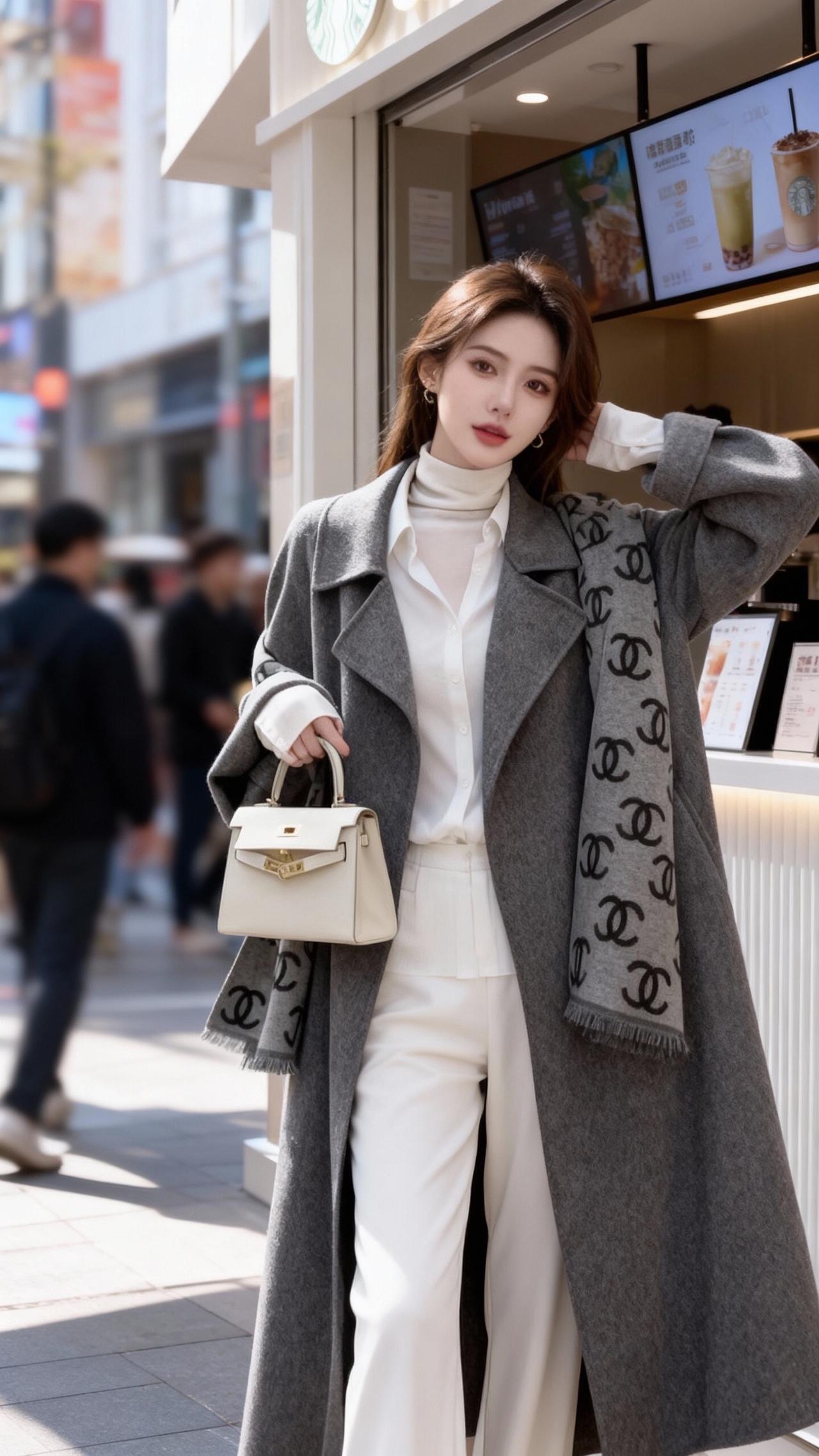 夜晚街头的优雅少女,浅灰色套装搭配黑色链条包,尽显时尚与魅力。性感紧身裤穿搭紧