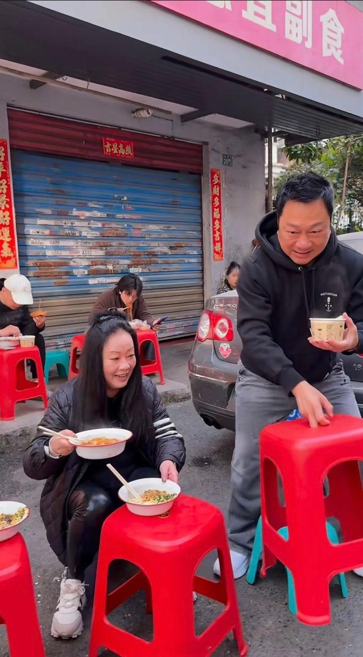黎耀祥夫婦武漢踎街邊歎5蚊麵在其中一段影片中,黎耀祥與妻子現身武漢街頭,體驗當地「過早」(吃早餐)文化。夫妻二人未有選擇高級餐廳,反而走進一家地道小店,點了武漢特色熱乾麵。令人驚訝的是,店外沒有餐桌,他們竟毫無架子,直接將麵碗放在紅色塑膠矮櫈上,然後各自再坐一張櫈仔,隨性地「踎街邊」大快朵頤。
