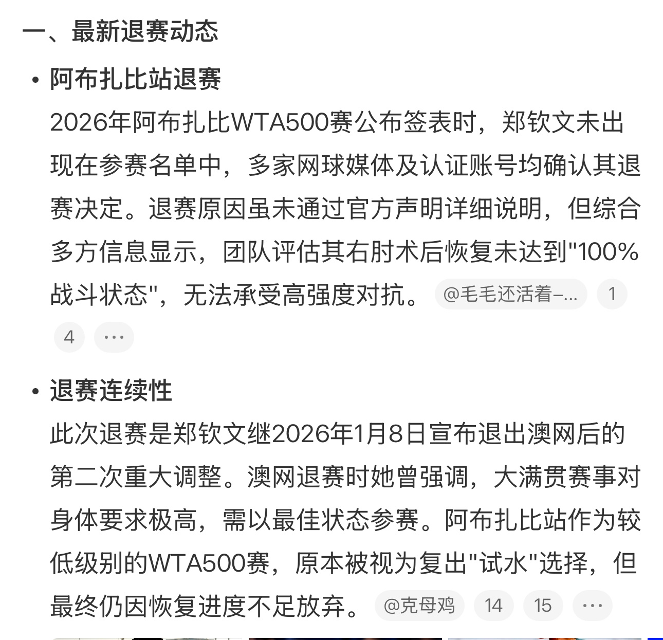 郑钦文退赛状态不好就调整好状态再来参加,这是对的……只是粉丝们还是希望能多看到郑钦文的比赛。热点观点 郑钦文退赛