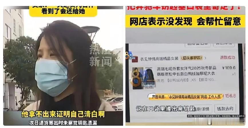 结局舒服了!浙江一女子退货时,忘记将奔驰车钥匙从衣服口袋拿出来,重配一把要6000元, 她想联系商家把钥匙要回来,但商家说不清楚情况。女子气愤不已,于是做了一个视频,将商家曝光了。 女子说,当时退货的时候,工作人员将衣服拿走了,并且将口袋里的东西也拿出来了,但是她忘记拿出一把奔驰车钥匙,回来想重新要回来,可是商家说,他们并不知道口袋里还有东西。 女子说,她看监控,发现工作人员并没有尽心尽力的去找钥匙,她气愤之下做了视频,曝光了商家。 对此,商家回应说:他们仓库没有监控,处理几百件退货的时候,没有发现还有一把钥匙。 网友表示,这钥匙能值6000元吗?真值的话,应该不退货啊,估计是这几天穿的衣服,退了吧,估计钥匙找不回来了。 还有人说,这钥匙就当花6000买个教训吧,你也知道不值6000,还非要要回来?要回来你也得花6000再配一把啊,就当买个教训了。 这女子也是蛮可怜的,碰到这样的人渣商家了,你就应该早点报警,让警察来处理,曝光不曝光的, 这钥匙到底能不能找回来还是个未知数呢,你说呢?