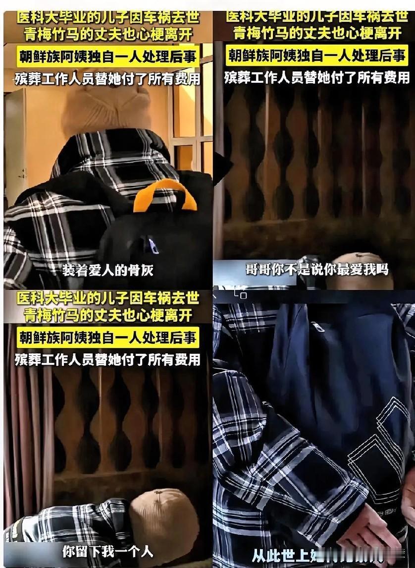 看了令人心酸,辽宁朝鲜族女子老公死了没钱买骨灰盒,用去世儿子的书包装骨灰。他们唯一的独子天津医科大学毕业, 成绩优异。没想到,天有不测风云,女婿酒后驾车将独子撞死在了马路上。丈夫心里十分难过,整天以泪洗面,思念去世的儿子,没想到却因此心梗离世。 女子十分悲痛,但想到丈夫和儿子都是为自己牺牲,自己身为家里的“罪魁祸首”,也只能自责难过。家里积蓄已经花完,现在赔偿都没希望,未来的日子要靠自己打工度日。 女子和丈夫相伴六十年,从未住过大酒店,也从未坐过飞机火车。这次不得已走进殡仪馆办丧事。 她用手里的钱准备给丈夫办丧事,哪知道第一家要8000元,她只有2000元现金,幸好遇上良心殡仪馆,看到她可怜用2000元给她按她的钱办妥丧事。 女子心里十分感激,她把儿子的书包拿出来,将丈夫的骨灰放在书包里,寄托对儿子的思念,不让丈夫的骨灰露在外面,不让路人看见,不让路人指指点点。