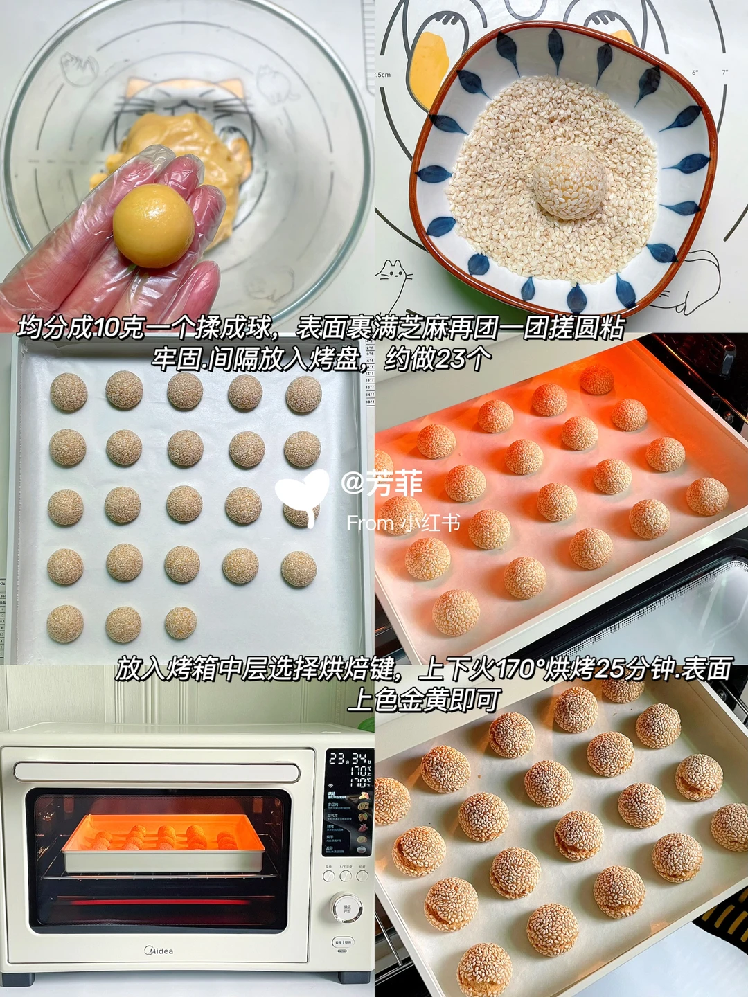 2️⃣均分成10克一个,揉圆滚一圈芝麻再放掌心团圆一下,避免芝麻脱落.间隔摆入烤盘