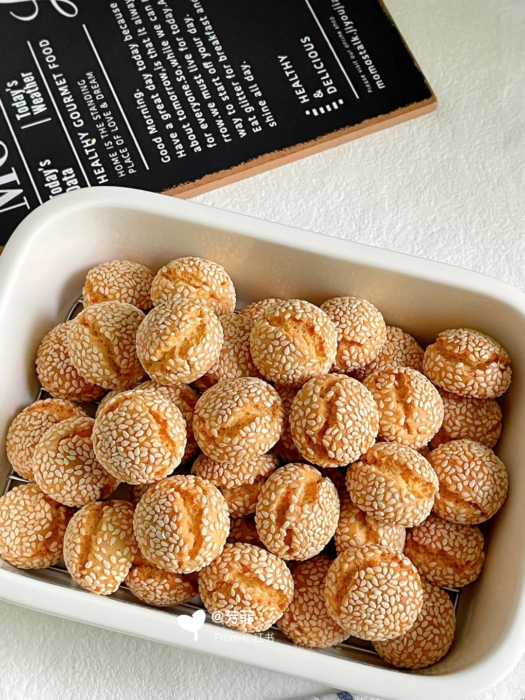 ✔️鸡蛋1个 玉米油30克 糖粉30克 盐1克 低粉110克 泡打粉2克 白芝麻适量