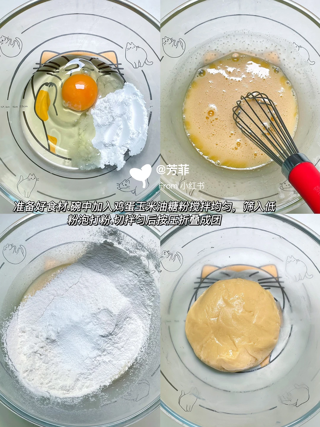 1️⃣准备好食材.碗中加入鸡蛋、玉米油、糖粉、盐搅打均匀,筛入低粉和泡打粉切拌混合匀再按压成团