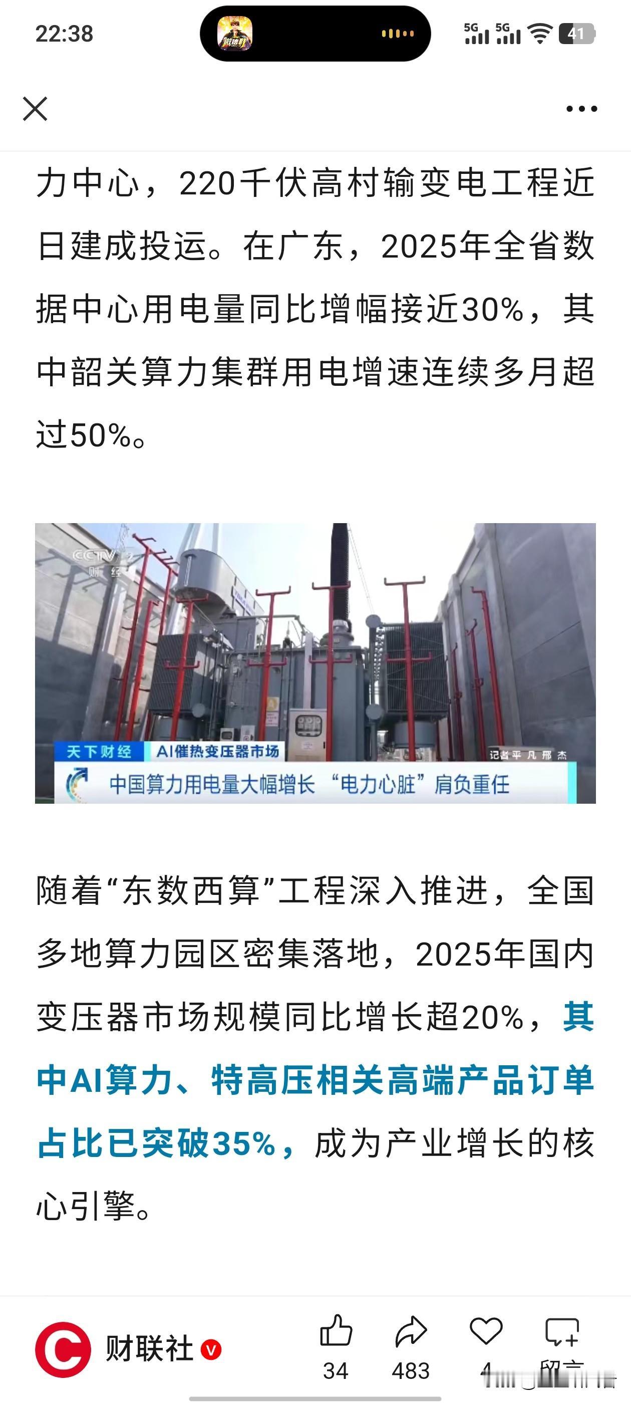 中国变压器全球爆单!AI算力"电力心脏"供不应求 最近变压器行业彻底火了!中国工厂订单排到2027年,美国市场交货要等两年多。为啥这么抢手?全球AI算力大爆发,数据中心、超算中心疯狂建,变压器作为"电力心脏"成了香饽饽。 广东、江苏的变压器厂满负荷生产,干式变压器出口猛增。2025年中国变压器出口646亿元,同比涨36%。国内算力中心用电量飙升——广东数据中心用电增30%,韶关算力集群用电连续多月涨超50%。"东数西算"工程推进,各地算力园区扎堆落地,高端变压器订单占行业三成以上。 简单说:AI要电、算力要电,变压器这个"老行业"正变成新基建的核心赛道,中国制造再次站上风口!(仅供参考,不作为投资依据)