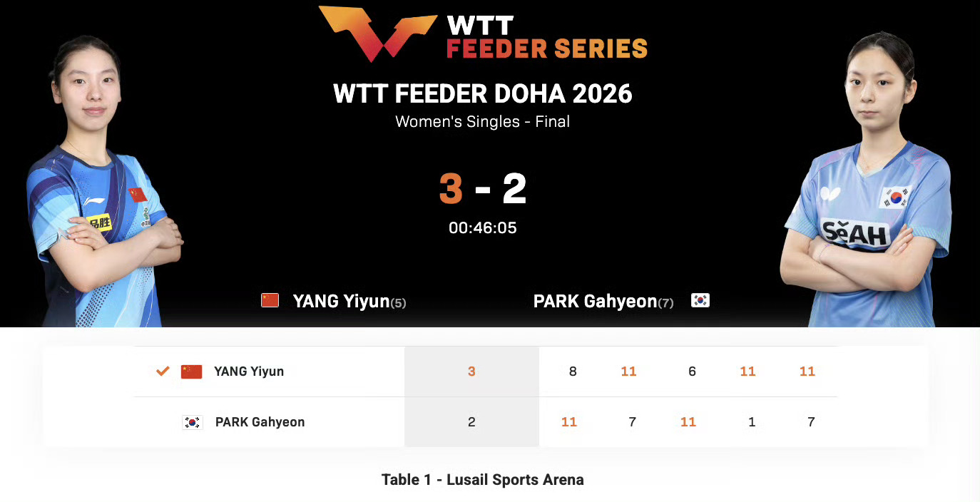 🏓2026WTT支线赛多哈站女单决赛,杨屹韵3比2战胜朴佳贤夺得冠军,比分8-11,11-7,6-11,11-1,11-7