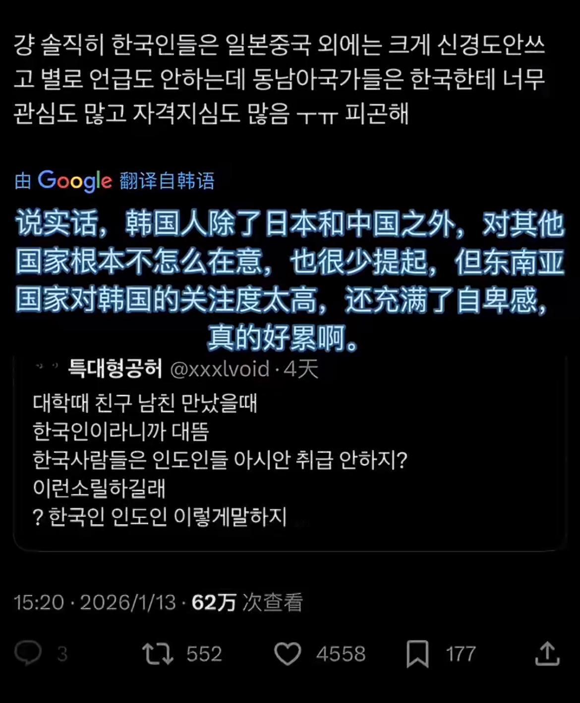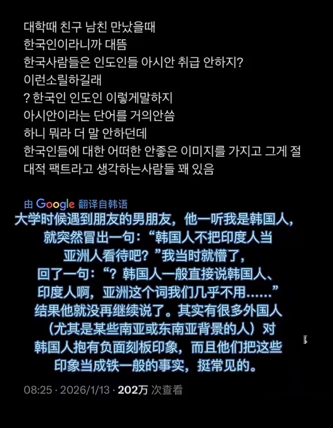 印度人认为韩国人不把印度人当作亚洲人,韩网友回复韩国人天天盯着中国日本,对其他亚洲国家都不感兴趣,而东南亚其他国家又总是关注韩国,而且他们还充满了自卑感 我觉得真正充满自卑感的是韩国吧,东南亚国家都挺松弛的,除了越南其他国家不会偷来偷去,只过好自己的生活