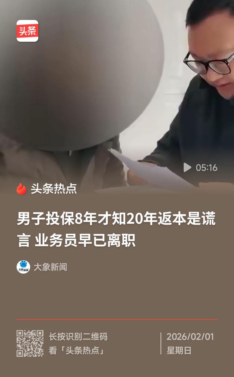 男子投保8年才知20年返本是谎言这简直是血的教训!熟人介绍的保险竟成了割韭菜的镰刀,销售为了赚昧心钱满嘴谎言,8年投入换来一场空。监管的缺位、行业的乱象,让普通人的养老钱成了某些人的提款机!