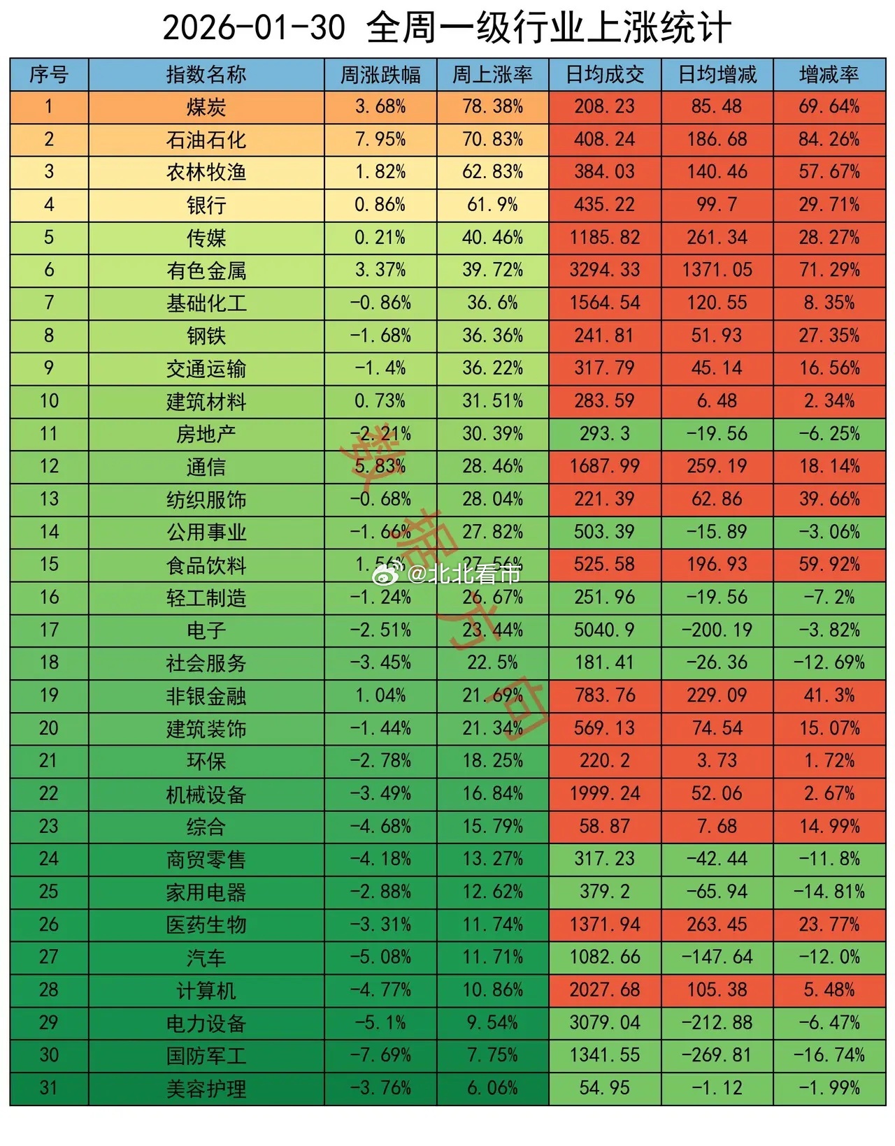 煤炭、石油石化、有色金属、基础化工、钢铁,一起进入本周行业榜单前10名