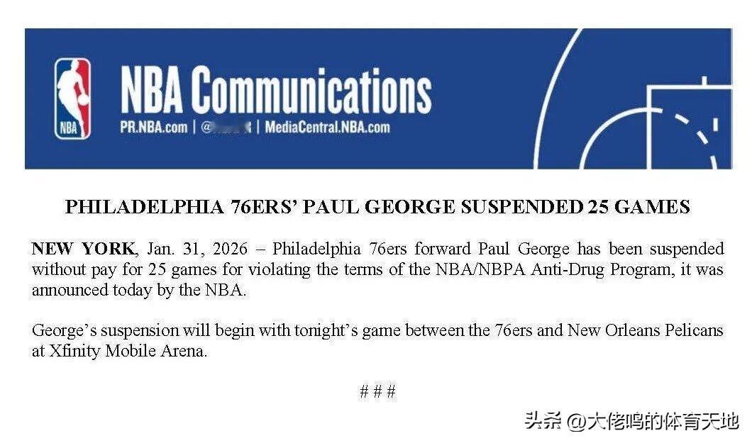 说实话,这处罚都不算重的了,还可以更重一些——因为违反联盟禁药政策,76人球员保罗乔治将被禁赛25场,他的第一场禁赛将从今天对阵黄蜂的比赛开始……而且还应该彻查,看联盟是不是真的没有此类现象了,抓一个罚一个,必须重拳出击,净化赛场氛围,才能良性发展![碰拳]