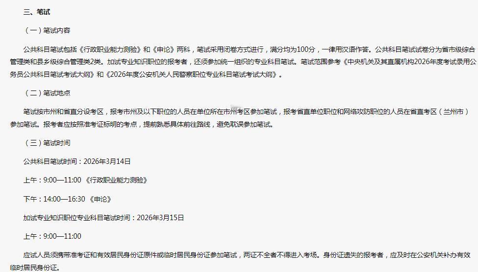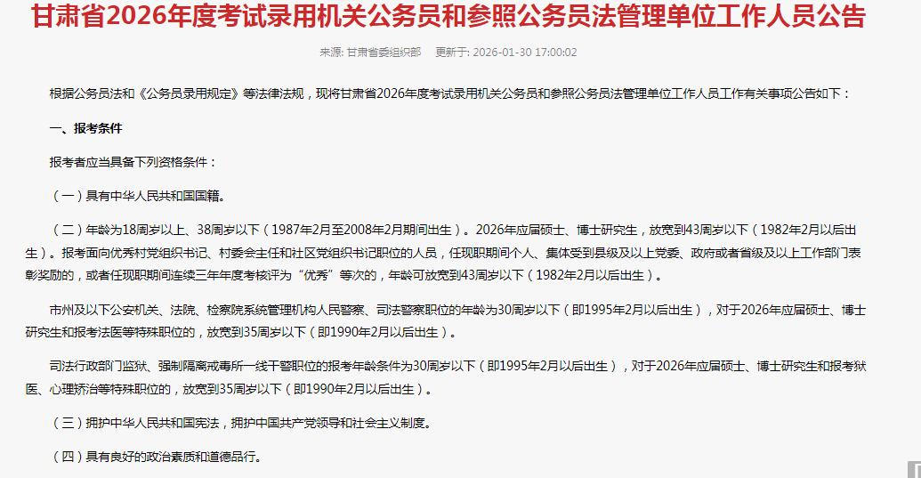 甘肃省2026年度考试录用机关公务员和参照公务员法管理单位工作人员工作报名时间:2026年2月2日8:30至2月8日18:00。公共科目笔试时间:2026年3月14日。