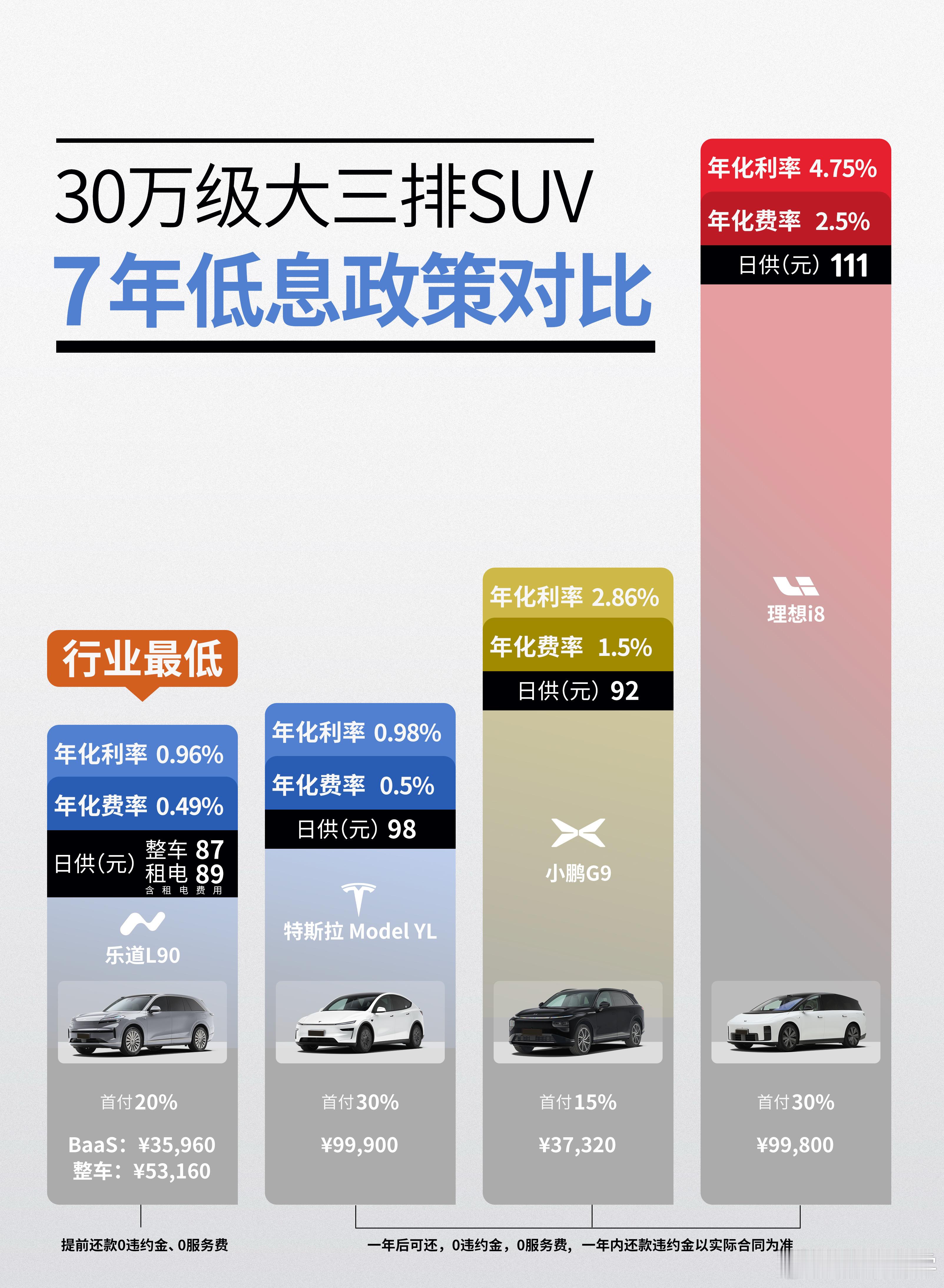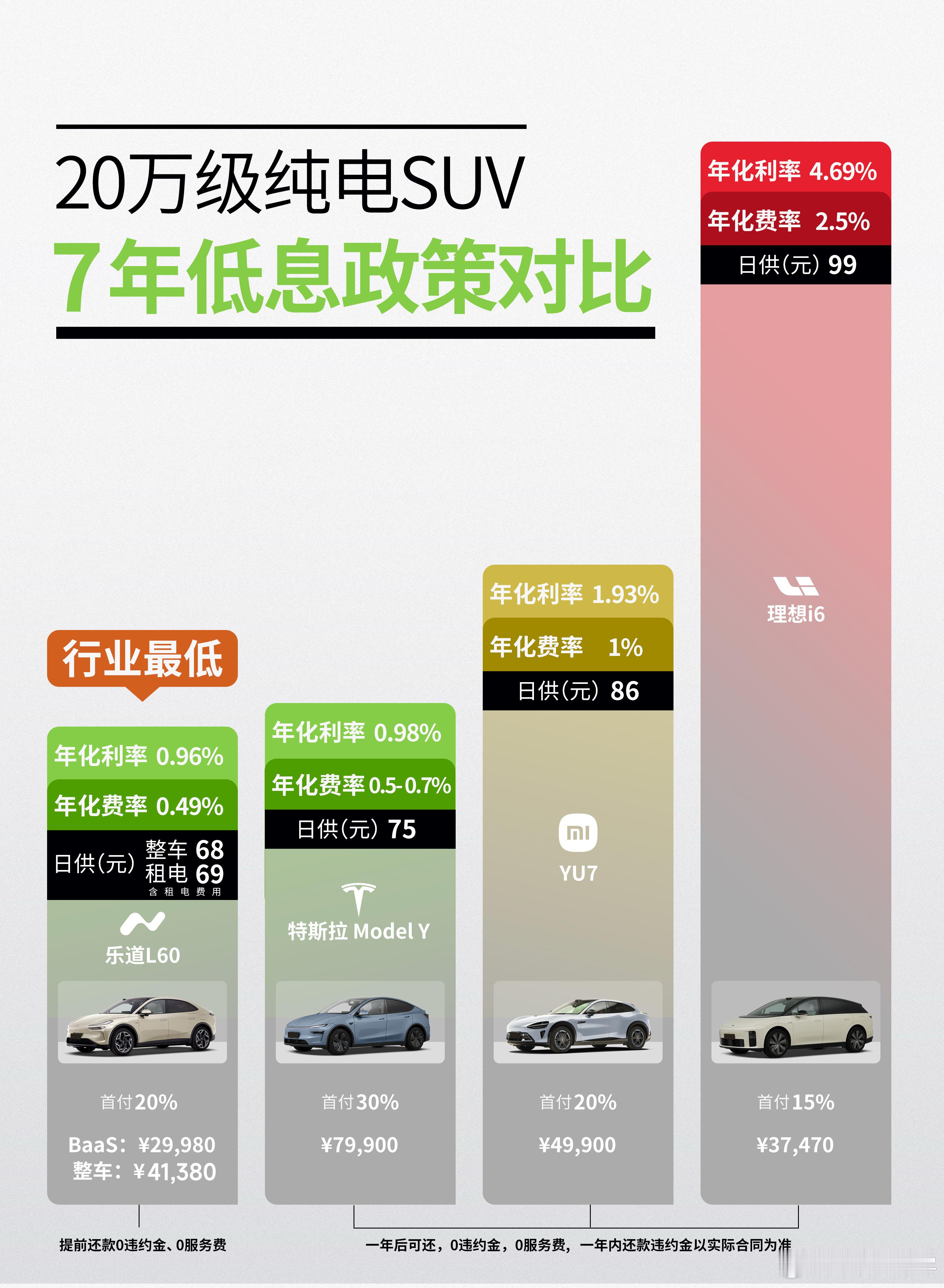 现在低息的竞争也很卷,图二就是之前各家的,今天乐道也宣布参战了。乐道汽车2月购车政策重磅加码,推出7年超低息金融方案:首付20%起,行业最低年化费率仅0.49%,全程0手续费,提前还款0违约金。即日起至2026年2月28日(含),购买乐道L60,首付29,980元起,日供低至69元*;购买乐道L90,首付35,960元起,日供低至89元*。