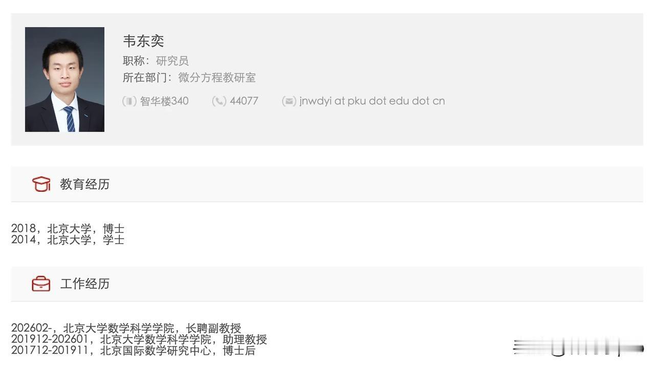 如果你还记得那位提着馒头和矿泉水、不善言辞的“北大韦神”,那他最近有了新身份。北大数学科学学院的网站悄悄更新了信息:从2026年2月起,韦东奕正式成了北大的长聘副教授。 这可不是一个简单的头衔变化。这意味着,那个在2019年底刚毕业、因为天才事迹“出圈”的年轻人,经过几年沉淀,获得了学校最高级别的学术认可。长聘,代表着一份无固定期限的合同和充分的学术自由,是象牙塔里无数人追求的安稳与信任。 回看他走过的路,你会觉得这像是注定的。从国际奥数满分金牌,到北大本博连读,再到留校任教,每一步都踩在纯粹的数学节拍上。去年,他参与的项目通过了国家自然科学奖初评,还被院士提名角逐北京市的科技大奖。这些扎实的成果,才是“长聘”二字背后最重的砝码。 所以,当“韦神”变成“韦教授”,我们看到的不是一个网红故事的续集,而是一个天才学者在适合自己的体系里,稳稳扎根、自然生长的结果。喧嚣总会过去,但馒头和矿泉水背后那份对科学的专注,终于等来了它最坚实的回响。这大概就是最好的安排。