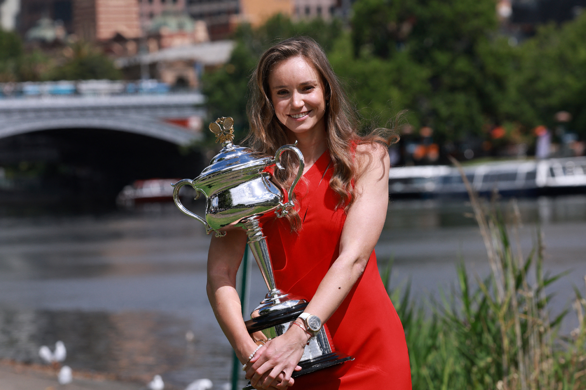 澳网新科冠军莱巴金娜,手捧达芙妮杯拍摄冠军写真,一袭红裙,笑容明媚✨
