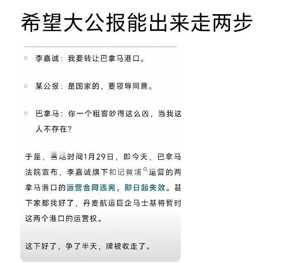 现在都在骂《大公报》,我非常不解,难道不应该骂巴拿马政府和背后的黑恶势力美国吗? 李嘉诚租赁的港口,大陆企业想买,李嘉诚狮子大开口,美国通过贝莱德购买,李嘉诚立马降价,这合适吗?《大公报》为什么不能批评? 美国一看无法购买,马上通过巴拿马政府硬抢,这是违反契约的行为,这群人不指责美国,却无理攻击《大公报》,说难听点,就是奴才思维,当奴才惯了,已经不敢说主子了, 当然还有一种原因,最近赴美签证要查网络言论,某些人不敢骂了,对比一下,还是《大公报》好欺负啊。