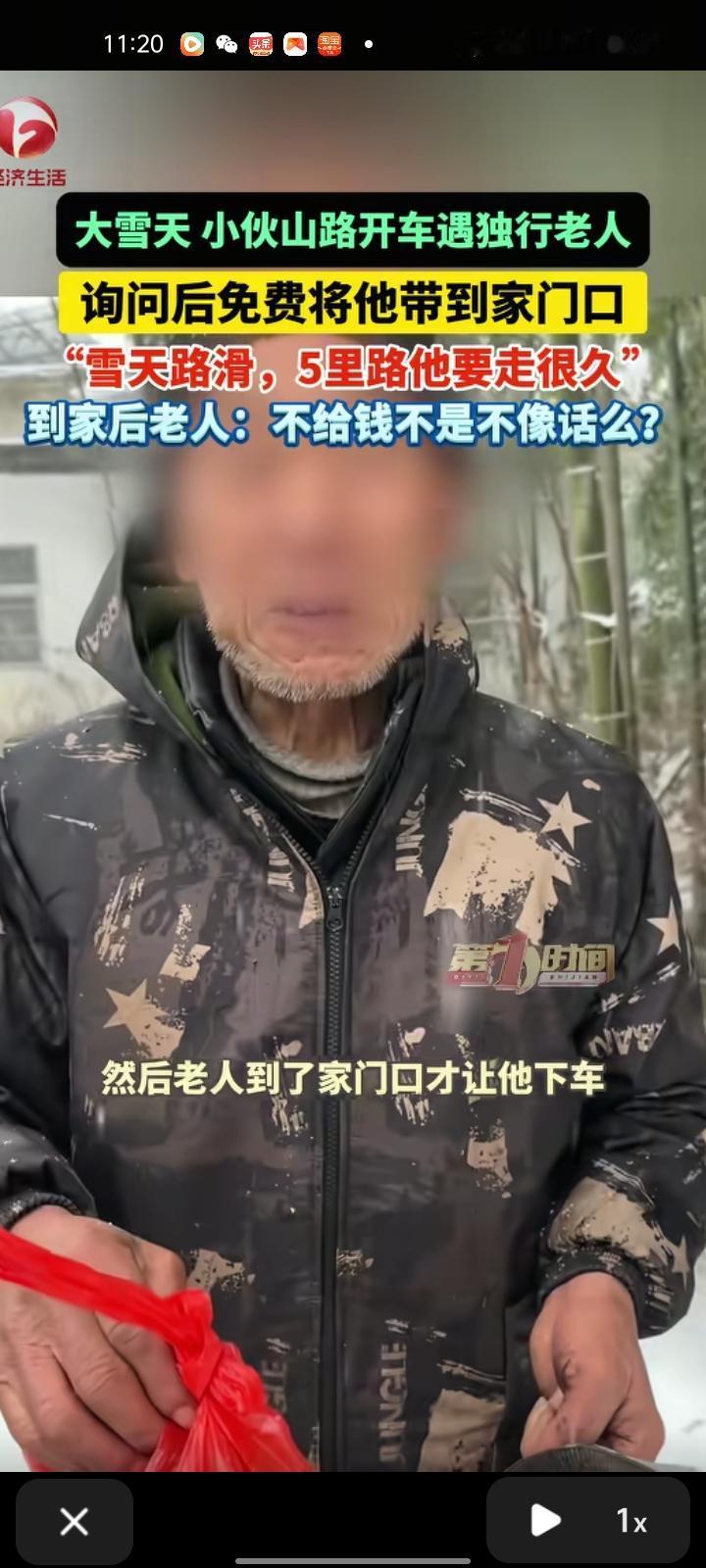 1月30日,安庆市岳西县。江先生在山路上看见一位老人在边上走着,大雪天的,老人这么大年纪不知道走多久,便免费把老人带上车,大概五公里的样子才送他到家。到家后,老人却说“不给钱不是不像话吗”,他说不要钱,毕竟年纪大的人要多关心一点。