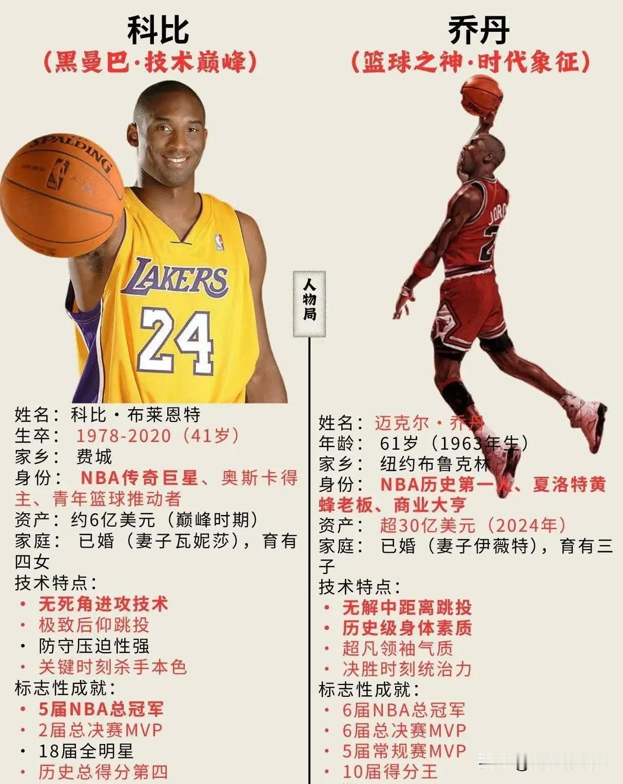 乔丹VS科比,两大历史顶级得分后卫。 乔丹,NBA历史第一人,上帝、神,老流氓,两个三连冠,6个FMVP,历史顶级身体天赋,意志坚定,世纪之投等,后辈景仰膜拜的对象。 科比,黑曼巴,小飞侠,年少成名,跳投美如画,扣篮飘逸又潇洒,三节62分,单场81分,攻防一体,极强的好胜心和不屈的斗志,可惜英年早逝。