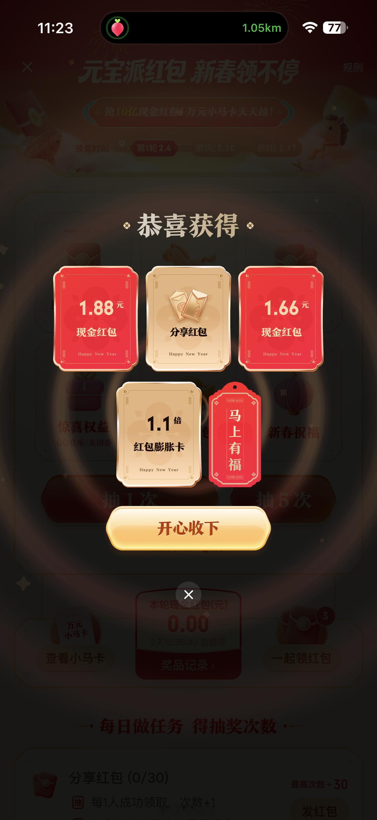 元宝红包还行吧中了3块9,比支付宝那个集福大气多了,我记得前两年支付宝各种扫福的
