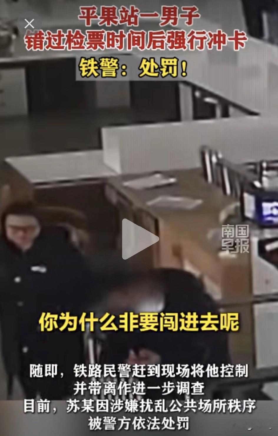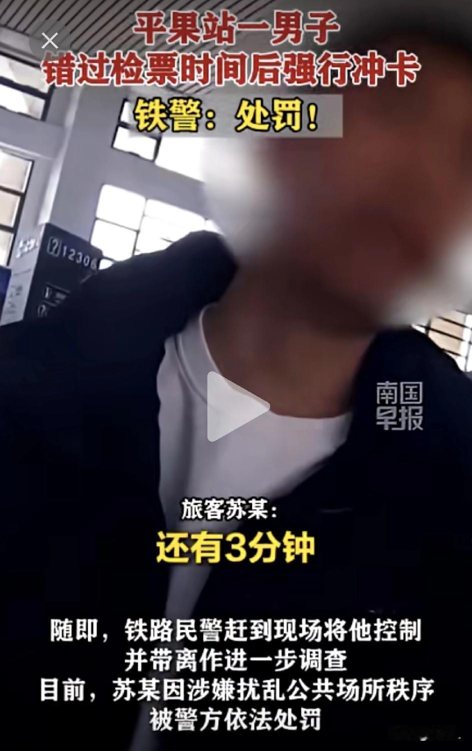 着急赶车不是理由!广西火车站男子发车前强行闯闸机,结局亮了!网友:记住不是车等你,是你等车! “让我进去!车还在站台呢!”广西平果火车站,一名男子因为迟到错过了检票时间,竟不顾工作人员劝阻,硬要从人工检票口闯进去。 民警当场将他控制,结果尴尬了。 1月22日下午1点50分左右,平果火车站,旅客苏某急匆匆跑到检票口,却发现闸机已经关了。 他要坐的D3824次列车去南宁,虽然还在站台上停着,没有驶离站台,但按照铁路规定已经停止检票了。 一般人这时候可能就认了,赶紧去人工售票窗口改签下一趟最近的列车。 但苏某不干,他直接冲向人工检票口,不顾工作人员阻拦,非要硬闯进去坐车。 执勤民警发现后,立即赶到现场将苏某控制住。苏某的行为已经涉嫌扰乱公共场所秩序,最终警方依法对他进行了处罚。 这苏某强行闯检票口,不仅违法,还可能危及自身和他人安全——万一扒车门、追列车,后果不堪设想。 而且,铁轨上的列车就像是流水线,谁几点到几点走,都是被严格控制的。一旦有车延误,势必会对后继的车辆造成一系列的麻烦和危害。 视频被广大网友热议: “规则不是摆设!” “车在眼前不让上,确实急人,但规矩就是规矩。” “要是人人都这样闯,车站不乱套了?” “提前5分钟停止检票是有道理的,要保障全车人的安全。” 马上就要进入一年一度的南北大迁徙了,春运期间的车多、人也多。所以大家赶车千万要提早,宁可到车站多等一会,也别卡点到。 这个时候一旦迟到上不了车,想改签那是难之又难,真的要看个人运气了,或许下一趟车也有人迟到刚好空出来一个位置。 不过,还是提醒大家,不要心存侥幸,春节出行: ✅提前规划时间:春运期间客流大,至少提前30分钟到站! ✅停止检票别硬闯:一般高铁提前3-5分钟停检,停了就是停了! ✅错过可改签:当天其他有余票的车次,都可以改签一次。不过春节期间,还是别报希望! 心急吃不了热豆腐,硬闯闸机更吃罚单。出行千万条,安全第一条;赶车不提前,吃亏在眼前! 各位谨记:早起半小时,顺顺利利,平平安安把家还!欢欢喜喜过大年! 素材来源:南国早报,侵联删!