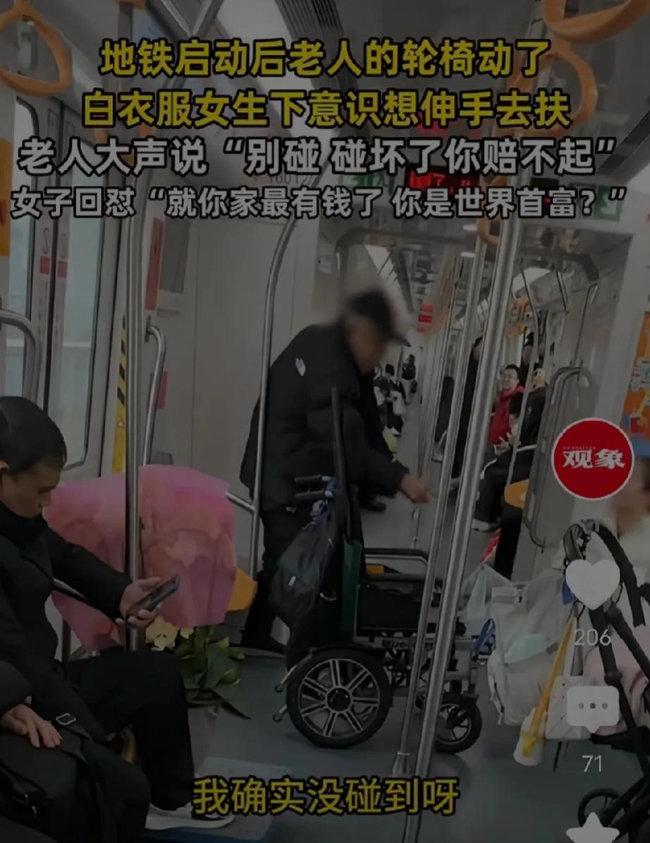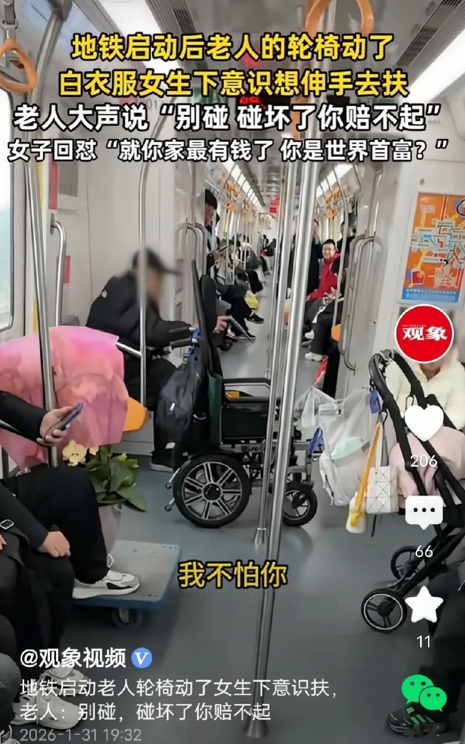 坏人变老了!浙江杭州,地铁启动,女子看到大爷的轮椅往前滑,好心上前扶一把,没想到,大爷立马指着女子骂:你别碰,碰坏了,你赔不起。女子委屈得不行:就你家最有钱,你是世界首富。网友:活该他坐轮椅。 1月31日,一网友发出视频,视频里是他在地铁里遇到的一件事。 只见视频中,一位7、80岁的左右大爷在指着一白衣女子骂骂咧咧,女子也显得有些激动,在跟大爷理论。 女子提醒大爷说,你别吵,你吵也吵不过我们年轻人,不要气坏了身体。 可能大爷骂她不懂得尊重老人,所以女子回怼大爷,我会尊重人,但我只尊重有素质的老人,这种爱吵架的老人我没法尊重。 大爷继续指着女子大声吼道:“我跟你说,我不怕你。” 女子接着回应他,有素质的人不会用手指着别人骂。 大爷说,我在提醒你,叫你不要碰我轮椅,我会用法律武器维护自己的权益。 原来,事情是这样的,大爷坐到地铁椅子上,他的旁边放着一把轮椅,白衣女子坐他对面。 地铁启动时轮椅跟着往前滑,女子出于好心也是出于本能反应,下意识地冲过去想要扶住轮椅,防止它往前滑动。 本来这是出于好意,她是在帮大爷,可大爷非但没有感谢女子,还大声对女子吼道:“你别碰,碰坏了你赔不起。” 女子懵了,真是好心没好报,自己本来是帮他,没想到竟被骂。 女子立马停手不管了,谁知大爷不依不饶,嘴里骂骂咧咧,没完没了。 女子忍不住了,才回怼大爷,你叫我不碰就不碰吧,我也没碰到。 大爷继续说,我是在提醒你,你可别乱碰,碰坏了你赔不起。 这话瞬间让女子火冒三丈,好心帮忙他不感谢也就算了,还说着那么伤人的话,女子直接回怼大爷:就你家最有钱,你是世界首富。 可能大爷的轮椅真的很贵,他把它当宝贝护着,所以,女子这么一碰,他心里久久不能平静,女子越跟他讲道理,他就越气。 大爷一激动还站起来,走向女子,指着她接着骂。 女子说,你让我不碰,我不碰就是了,我从这里走路过去,最后也没碰到,你还啰嗦什么呢? 大爷继续嚷嚷着,我那是在提醒你,我怕你碰着了,我跟你说,我可不怕你。 看了这个视频气愤不已,就像女子说的,我们该尊敬老人没错,但是应该尊敬的是有素质的老人。 有的老人的确让人不解,就像视频中的老人,女子本意是想帮助他扶轮椅,防止轮椅往前方滑动,没想到他*眼看低人,他觉得自己的轮椅贵,人家买不起。 不就是碰一下吗,有必要那么大动干戈吗,如果真的碰一下就坏了,那这把轮椅的质量有待商榷,再说了碰一下就坏的轮椅真的有那么贵吗? 有人说,女子好心扶轮椅,本是举手之劳的善意,大爷非但不领情,反倒恶语相向、反复叫嚣“碰坏赔不起”,这般态度实在寒心。 尊老敬老是本分,但尊重从来都是相互的,从来不是倚老卖老、轻视他人的资本。 大爷因护着轮椅就否定他人善意,以恶意揣度好心,既伤了助人者的心,也丢了自己的体面。 善意经不起消耗,若人人都这般将他人好意当冒犯,只会让人心渐冷、温情渐少。 愿长辈们能懂善意可贵,别让狭隘与偏见,辜负了旁人的一片热心。
