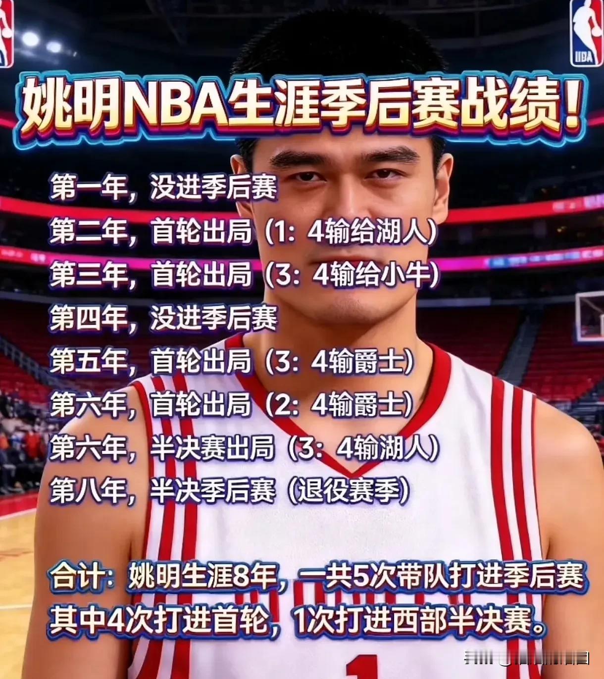 姚明季后赛成绩。 一个中国人,以一己之力,让NBA在中国风靡,让火箭主场成为中国红,他让中国人认识了NBA,也让老外们重新认识了中国。 他开启了国人踏出国门去国外打球的热潮,才有后续的易建联、周琦、崔永熙、杨瀚森们。 他拖着高大的身躯,除了NBA赛场,国际比赛、世锦赛、奥运会、亚运会比赛,场场不落。 成绩、季后赛、总冠军不是唯一的评判标准,假如姚明能再打八年,会有一个总冠军吗?假如姚明步两头跑打那么多比赛,他的职业生涯会多久?