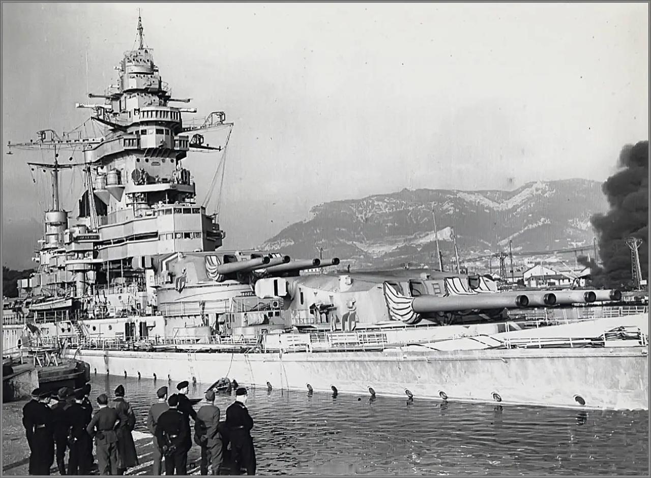 德军4号坦克与法国“斯特拉斯堡”号战列舰合影 1942年11月,德军4号坦克在土伦港与自沉后的法国战列舰“斯特拉斯堡”号同框。
