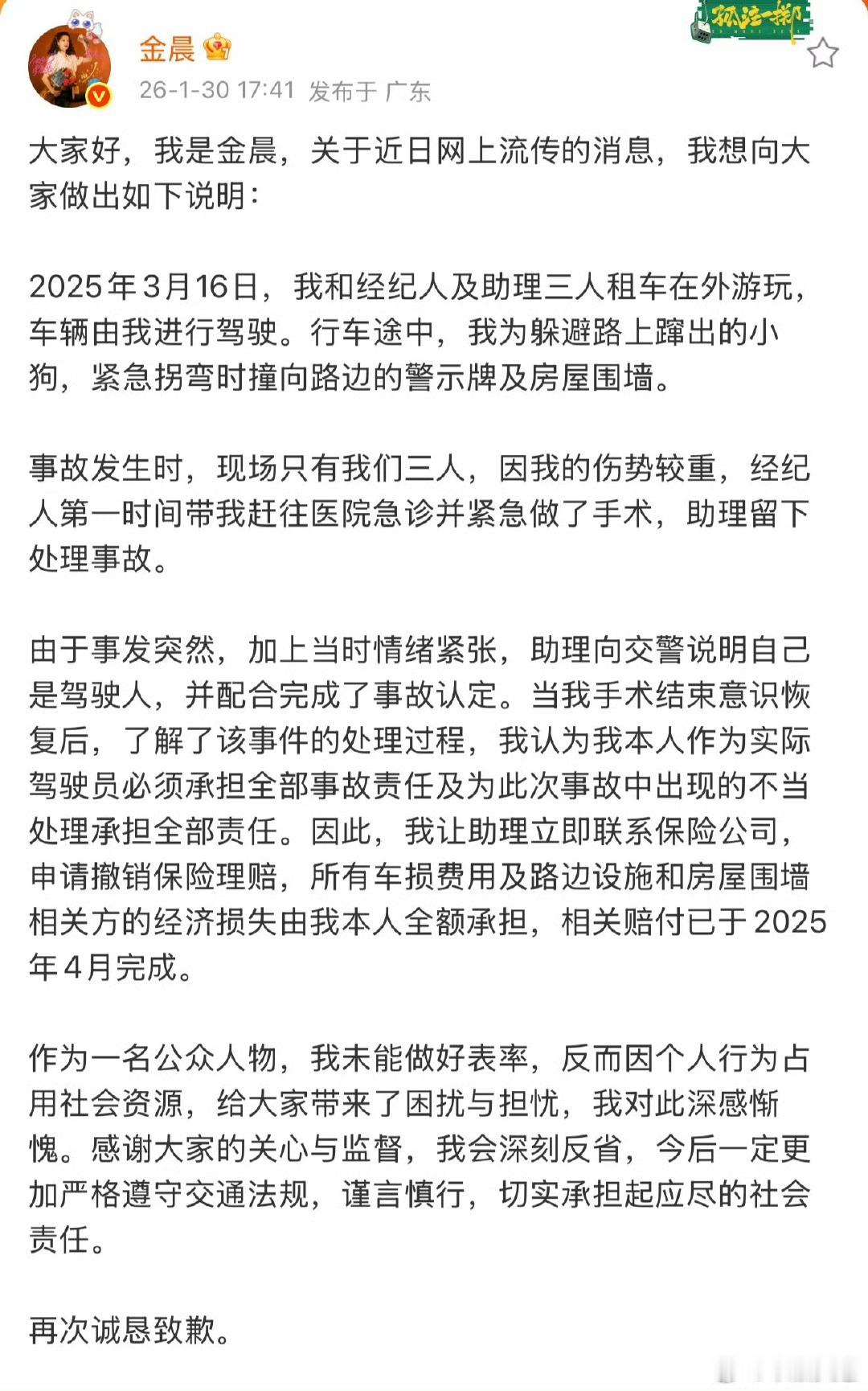 狗仔说金晨事故认定书没有狗的事儿大过年这个瓜是吃不完了