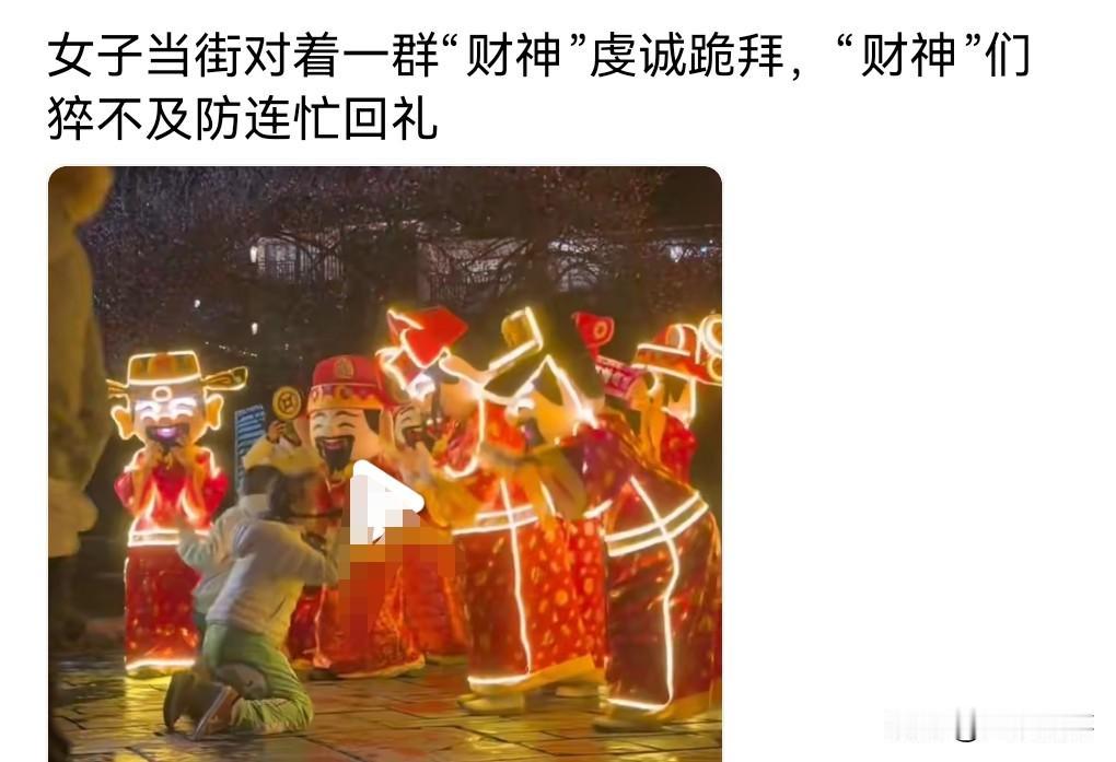 这真是太搞笑。1月31日(发布)。 一女子当街对着一群扮演的“财神”跪拜,这群“财神”们也鞠躬回礼。 心里想说,这真的是承受不起呀。 唉,可惜败了也没什么用,凡事只能靠自己。
