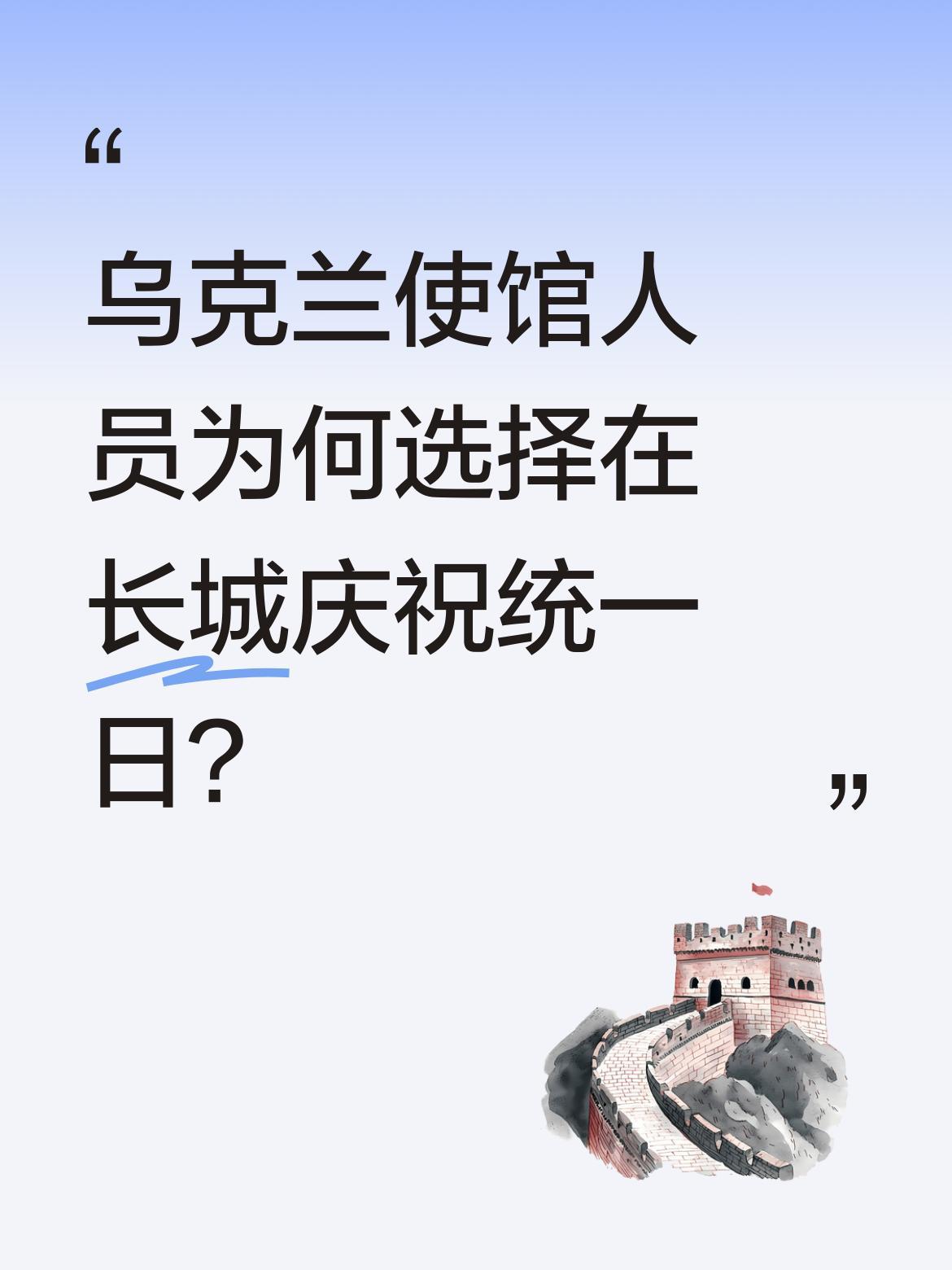 乌克兰使馆人员为何选择在长城庆祝统一日? 近日,乌克兰驻华使馆人员登上长城,以特殊方式纪念本国统一日。作为世界文化遗产,长城象征着坚韧与团结,这样的选择引发不少关注。不同国家在重要纪念日有不同的庆祝方式,你们觉得在海外如何表达文化认同更有意义?