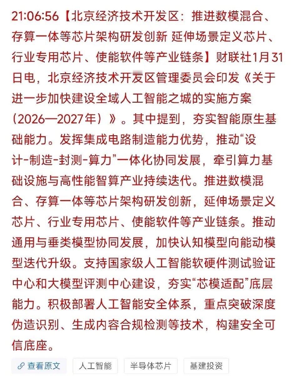 这些板块迎来利好消息催化北京经济技术开发区《全域人工智能之城实施方案(2026—2027年)经开区《全域人工智能之城实施方案(2026—2027年)》聚焦“6G+AI融合、量子计算、存算一体芯片、智算基础设施、智能网联汽车、AI安全、开源生态”七大核心方向,通过实验室建设、产业链一体化政策推动硬科技突破与场景落地,覆盖通信、算力、芯片、汽车等多赛道,具备中长期产业趋势支撑,将直接催化相关产业链核心标的。受益概念股梳理分析1. 通宇通讯:6G天线核心企业,布局太赫兹通信技术,适配6G+AI融合测试验证需求,技术壁垒高,获政策催化,订单增长明确,具备成长属性。2. 信科移动:6G技术研发龙头,参与国际标准制定,适配6G+AI通信场景验证,技术储备深厚,受益政策红利,业绩弹性充足。3. 中科曙光:智算与量子计算核心企业,布局“量电融合”基础设施,适配异构验证平台需求,技术壁垒高,获资金聚焦,订单增长明确。4. 浪潮信息:AI服务器龙头,适配智算中心迭代需求,技术实力突出,受益算力一体化政策,业绩稳健,具备长期成长属性。5. 国盾量子:量子通信龙头,布局量子计算基础设施,适配“量智融合”场景验证,技术壁垒高,获政策催化,订单增长明确。6. 寒武纪:存算一体芯片龙头,布局数模混合芯片架构,适配芯片产业链升级需求,技术实力突出,受益政策红利,具备成长属性。7. 中芯国际:半导体制造龙头,推动“设计-制造-封测-算力”一体化,适配芯片产业链政策,技术实力突出,订单增长明确。8. 北方华创:半导体设备龙头,适配存算一体芯片研发需求,技术壁垒高,受益芯片产业链政策,业绩稳健。9. 德赛西威:智能网联汽车核心企业,布局自动驾驶与智能座舱,适配智能网联领航行动,订单增长明确,业绩稳健。10. 中科创达:智能驾驶操作系统龙头,适配端到端智能驾驶需求,技术实力突出,受益智能网联政策,具备成长属性。11. 启明星辰:AI安全核心企业,布局深度伪造识别技术,适配AI安全体系建设,技术壁垒高,订单增长明确。12. 奇安信:网络安全龙头,布局生成内容合规检测技术,适配AI安全底座建设,技术实力突出,获政策催化,业绩弹性充足。13. 拓维信息:开源生态核心企业,布局AI开源框架与智算服务,适配开源协作生态政策,获资金聚焦,具备成长属性。14. 神州数码:AI算力与开源生态服务商,适配智算平台需求,技术实力突出,受益开源生态建设,订单增长明确。15. 四维图新:智能网联汽车核心企业,布局高精度地图与自动驾驶数据,适配智能网联领航行动,技术壁垒高,业绩弹性充足。16. 万集科技:智能网联感知龙头,布局激光雷达与V2X技术,适配车路协同需求,受益智能网联政策,具备成长属性。17. 光迅科技:6G光模块核心企业,布局太赫兹光通信技术,适配6G+AI融合通信需求,技术壁垒高,订单增长明确。18. 亨通光电:6G与量子通信企业,布局太赫兹通信与量子保密通信,技术储备深厚,受益6G+量智融合政策,业绩稳健。19. 商汤-W:AI大模型龙头,布局通用与垂类模型,适配认知模型升级需求,技术实力突出,获政策催化,订单增长明确。20. 科大国创:量子计算与AI融合企业,技术储备深厚,适配“量智融合”场景验证,获政策支持,具备成长属性。总结这政策明确了AI与硬科技融合的中长期发展路径,覆盖6G、量子计算、存算一体芯片等核心赛道,具备产业趋势支撑。建议优先选择技术壁垒高、订单确定性强的龙头标的,关注6G+AI、算力基础设施、智能网联汽车等主线,规避纯题材炒作,把握政策驱动下的结构性机会。