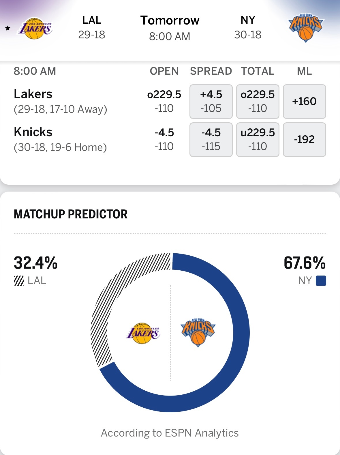 湖人明日8点对阵尼克斯,ESPN给出获胜概率:湖人32.4%,尼克斯67.6%。当前指数,尼克斯-4.5。 湖人vs尼克斯